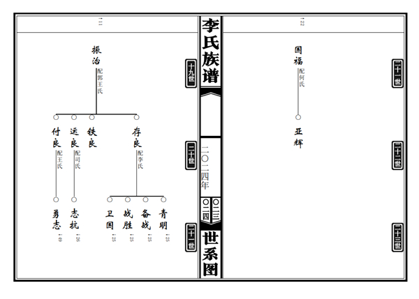 李氏族谱采用常用的吊线中置样式,每图三代,上下各有链接页码,世数标签下附有排行字。宣纸印刷,成品规格为26乘16。显得非常美观,值得珍藏。