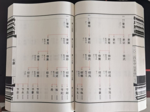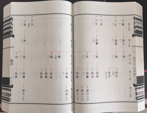 杨氏族谱内容简单,只有生子配氏情况,格式采用北方常用的苏氏吊线图。宣纸印刷,仿古线装268个筒子页。