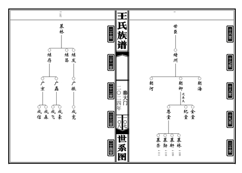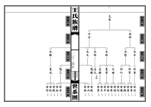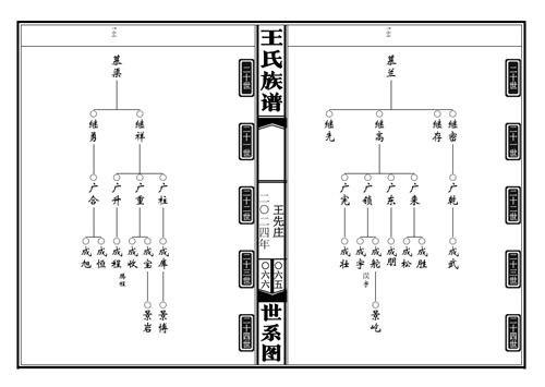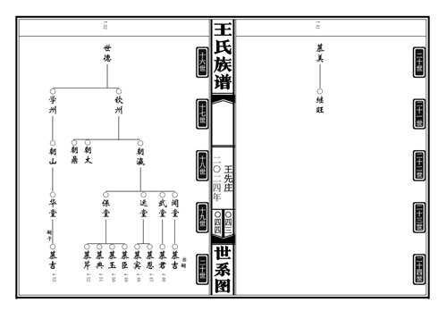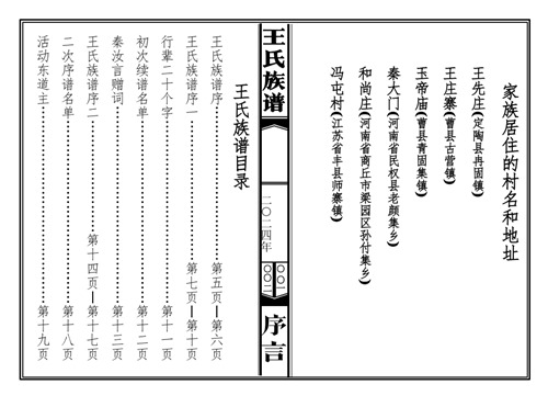 定陶冉堌镇王先庄王氏族谱 王先庄村有棵“八路树”,是一棵树龄达600多年的老槐树,之所以叫它“八路树”,是因为在在抗日战争时期曾为八路军提供过许多帮助,并因此备受当地群众爱戴。王先庄王氏宗亲在联系到我们后由递交资料到定稿仅用一周时间,也是我们修谱时间最短的一家,因为他们要赶在春节前拜谱。王氏包括王先庄、秦大门、和尚庄、寨东头王庄、江苏丰县冯屯等六个村庄族人,族谱体例采用吊线中置图,五世一提,只显示男性,不具配偶,42克宣纸印刷,大16本,缎面六目仿古线装,全一卷,由77779193永利排版印制,另定制了一副挂谱,亦采用吊线中置图,上列十九世及以上先祖,世系清楚。 ...