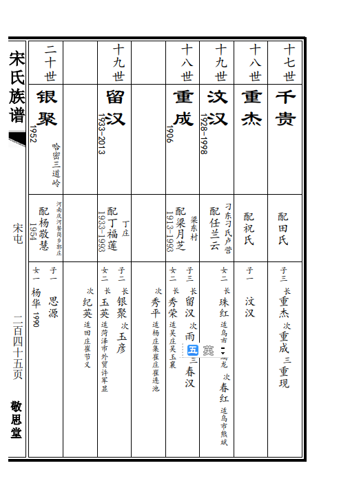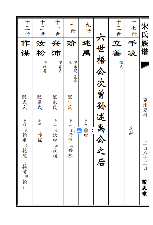 郓城宋氏族谱 2023年初,郓城宋屯村通过抖音知道我们专业的修谱公司,邀请我们过来洽谈,对我们有了更深入的了解,于是按我们的程序开始了修谱之旅。他们有的用表格式,有的用划线式,有的用条目式,有的干脆用电子表等多种样式将世系信息提供给我们。我们这些信息输入数据库,并按宗亲们的要求设计了谱式,经过多次校对修改,于2023年冬付梓印刷。 宋氏族谱全一册,计六百余页,行传式,内容除了配氏生子生女等信息,还列出每个人的生卒年月日,女儿所适何村何门,夫婿名讳等。此体例是在原体例的基础上变通修改形成的,有其独有的风格。 ...