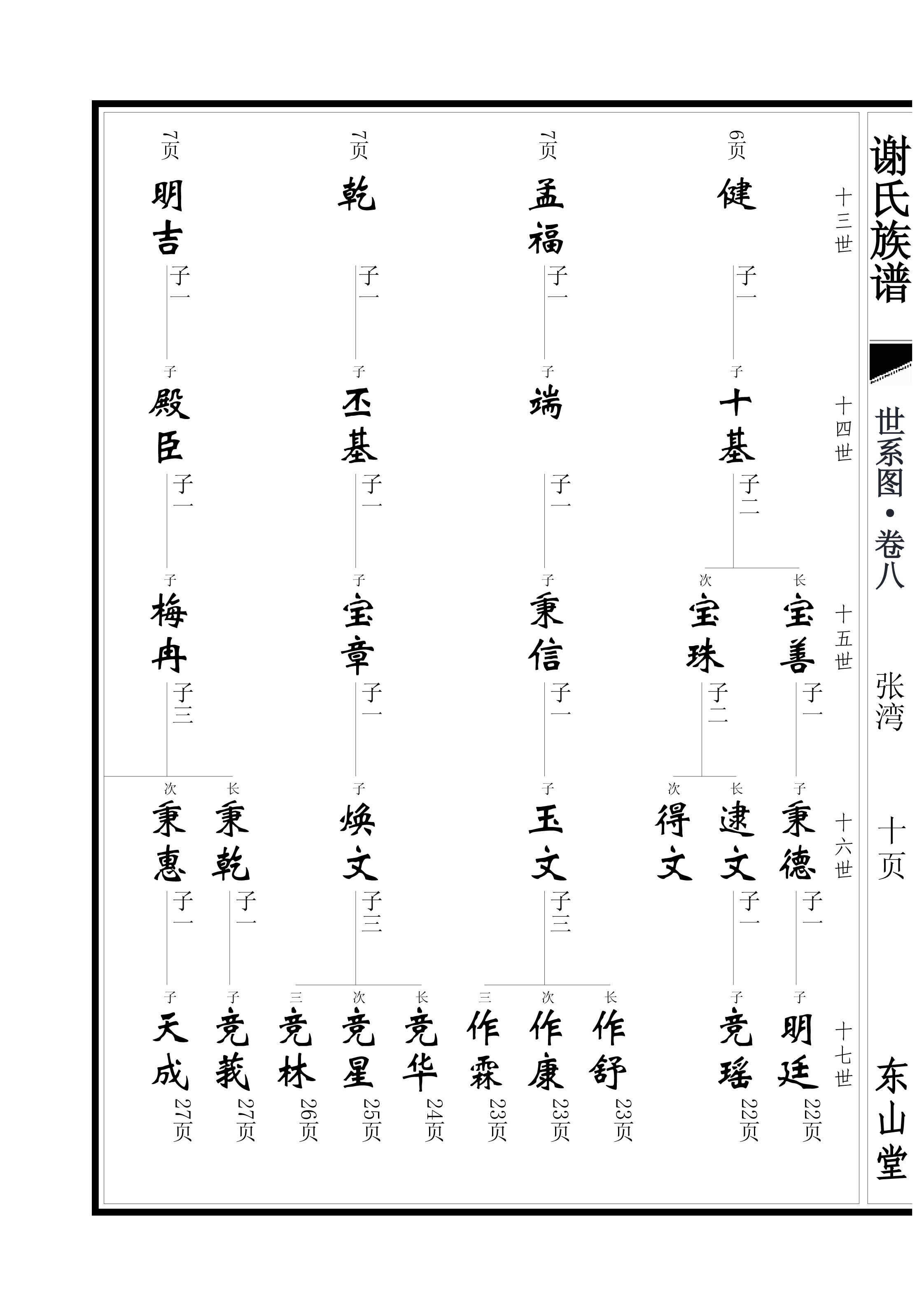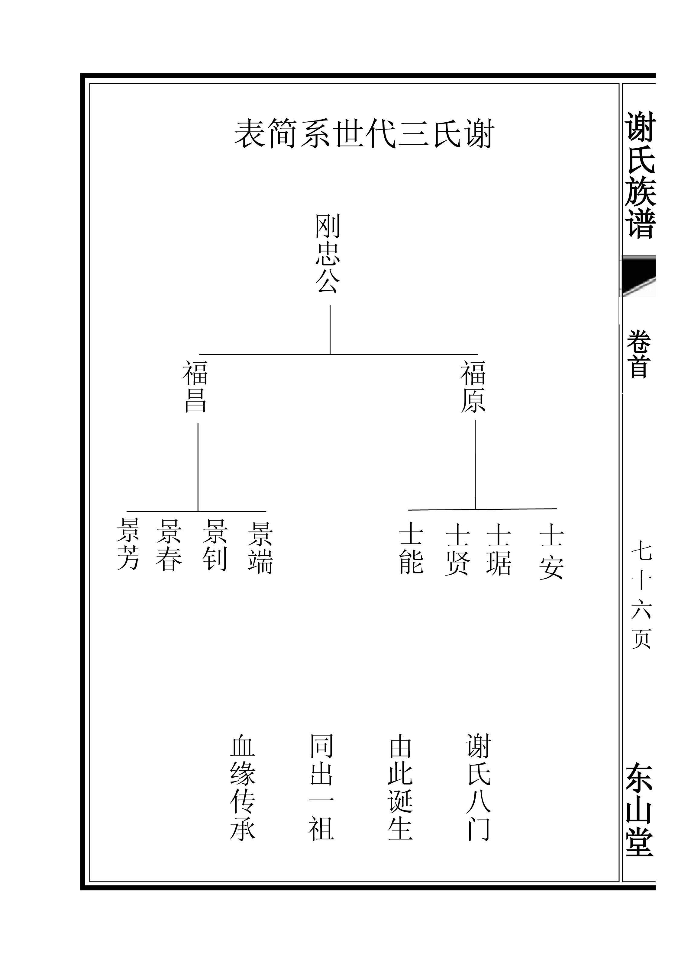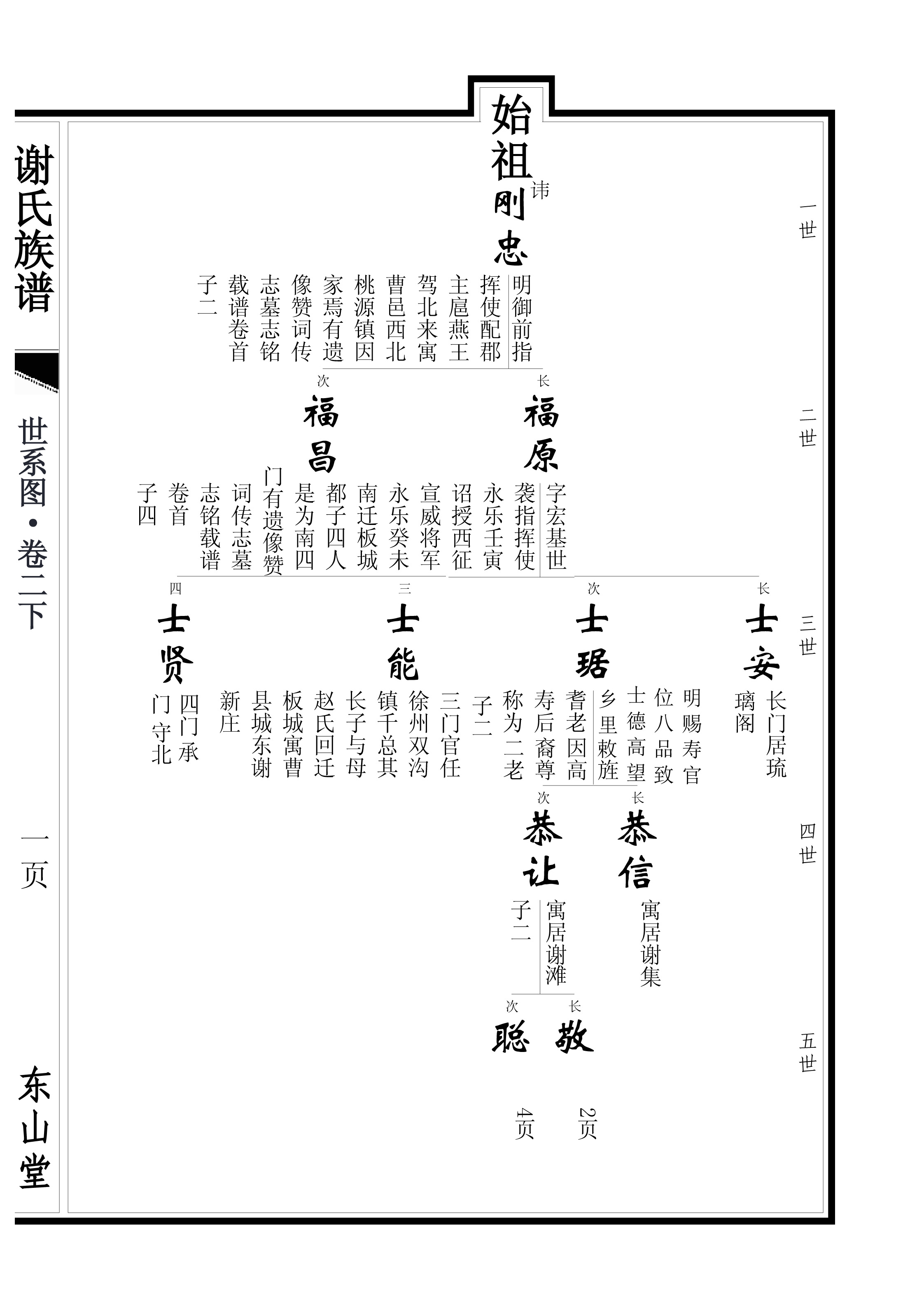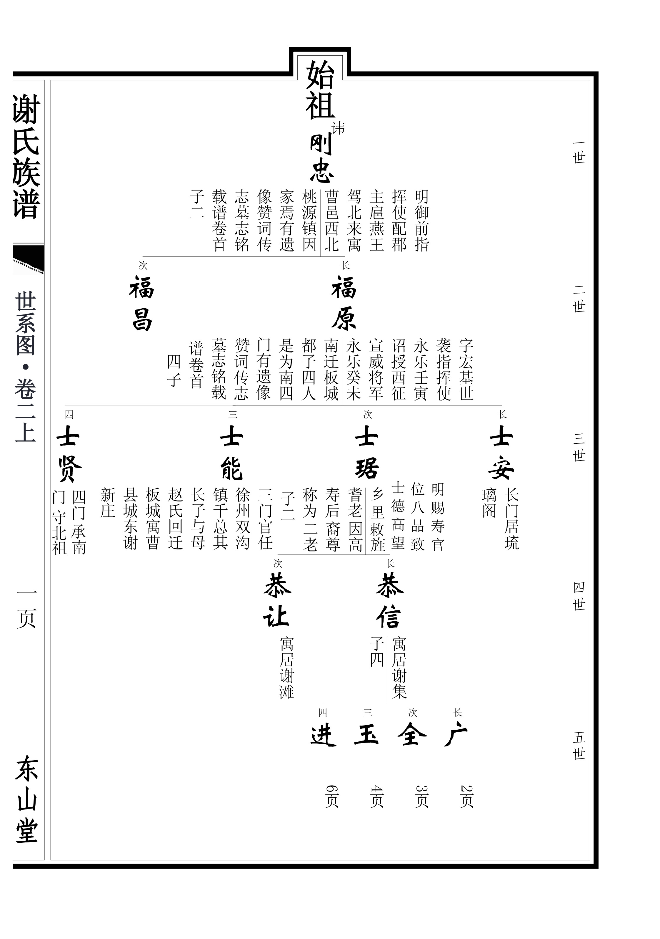 主持人:谢新周,原曹县政府办公室主任。卷首内容分先祖像赞、谱说序言、碑铭祠记祭文、艺文志、谢氏家训、历次修谱人员等,其它各卷分述各支世系图。本谱样式系主要根据原谱样式设计,内容较为简单,只列出配偶及生子情况,或有功名者亦列出。每支开始列出其上第五世祖名讳,也等于是按五伏排序,每页最上和最下一世有上下链接页码,供查阅,分布设计采用吊线中置图,即父亲在兄弟中间。名字采用魏碑字体,典雅古朴,其它简介部分用宋体,清晰明朗。 ...