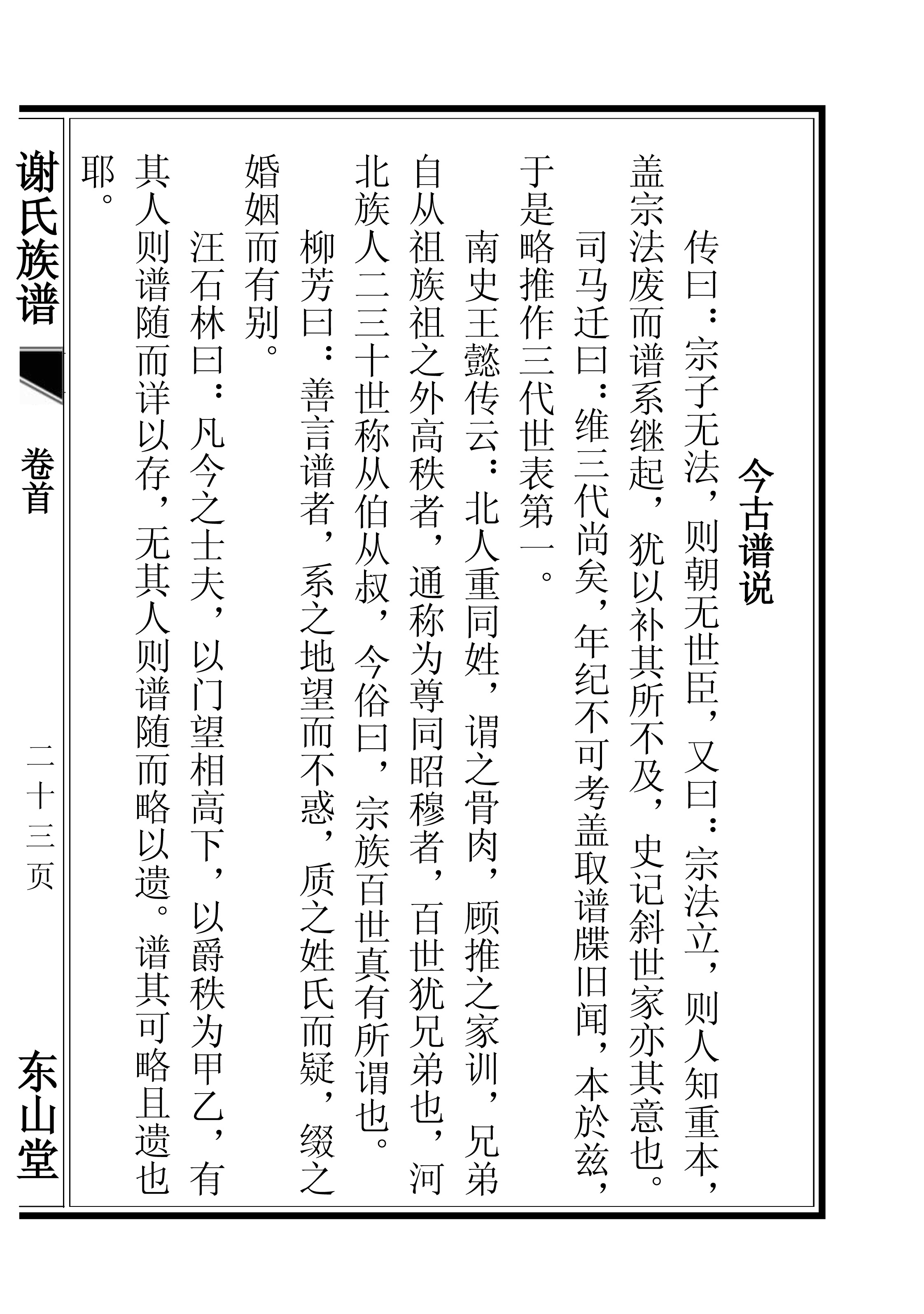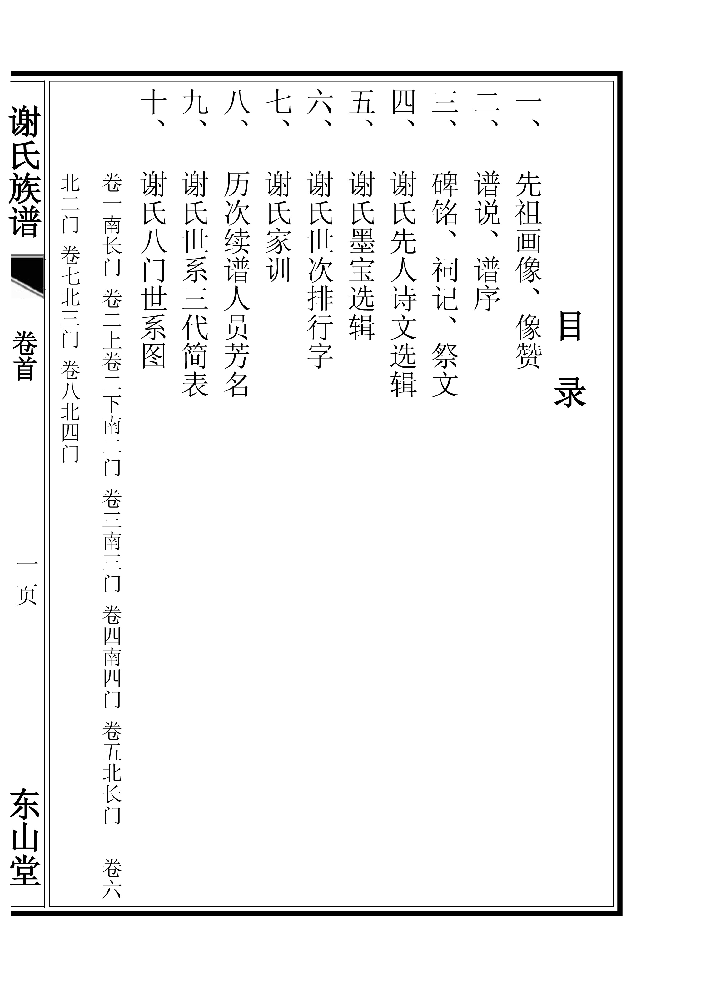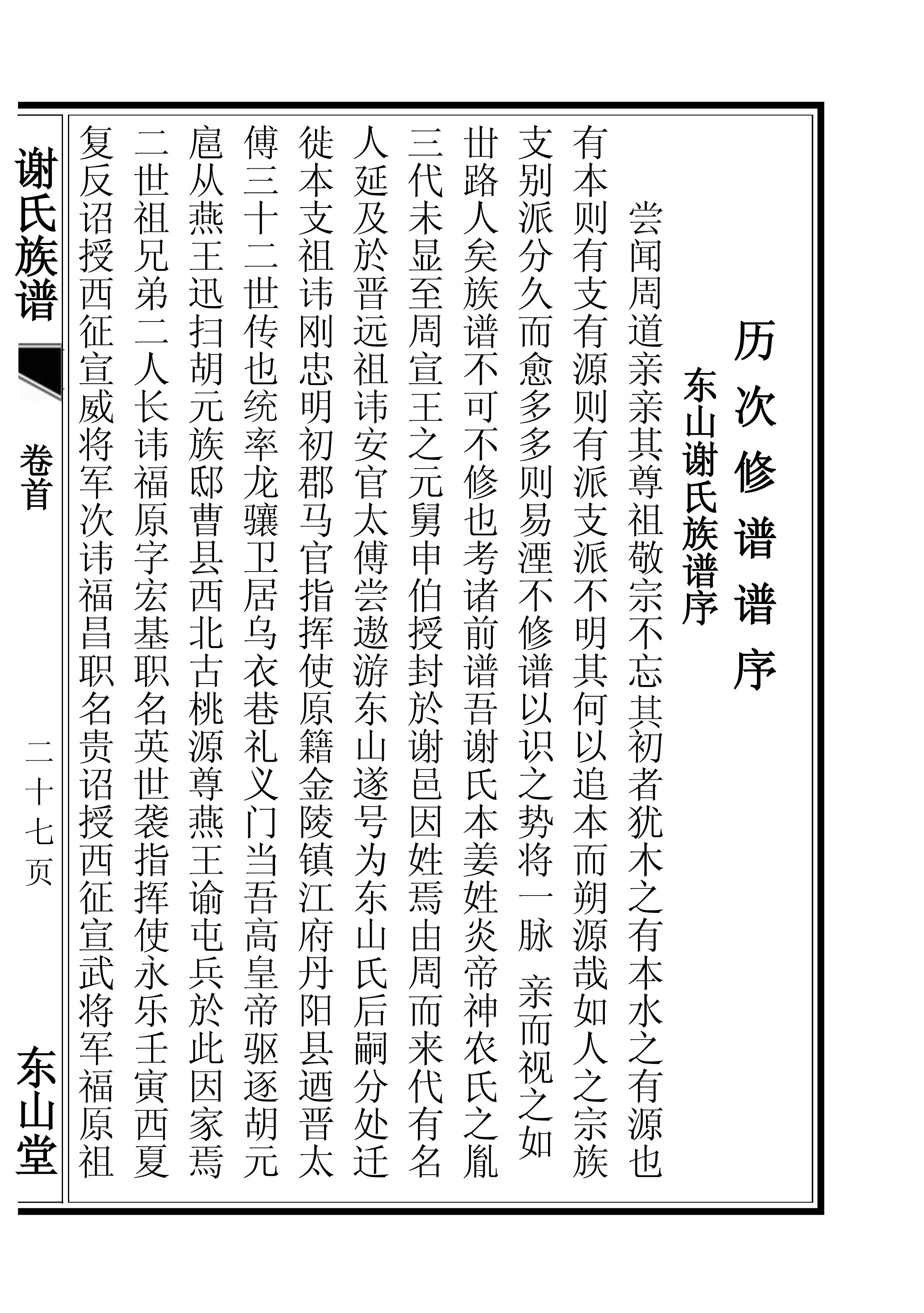 主持人:谢新周,原曹县政府办公室主任。卷首内容分先祖像赞、谱说序言、碑铭祠记祭文、艺文志、谢氏家训、历次修谱人员等,其它各卷分述各支世系图。本谱样式系主要根据原谱样式设计,内容较为简单,只列出配偶及生子情况,或有功名者亦列出。每支开始列出其上第五世祖名讳,也等于是按五伏排序,每页最上和最下一世有上下链接页码,供查阅,分布设计采用吊线中置图,即父亲在兄弟中间。名字采用魏碑字体,典雅古朴,其它简介部分用宋体,清晰明朗。 ...
