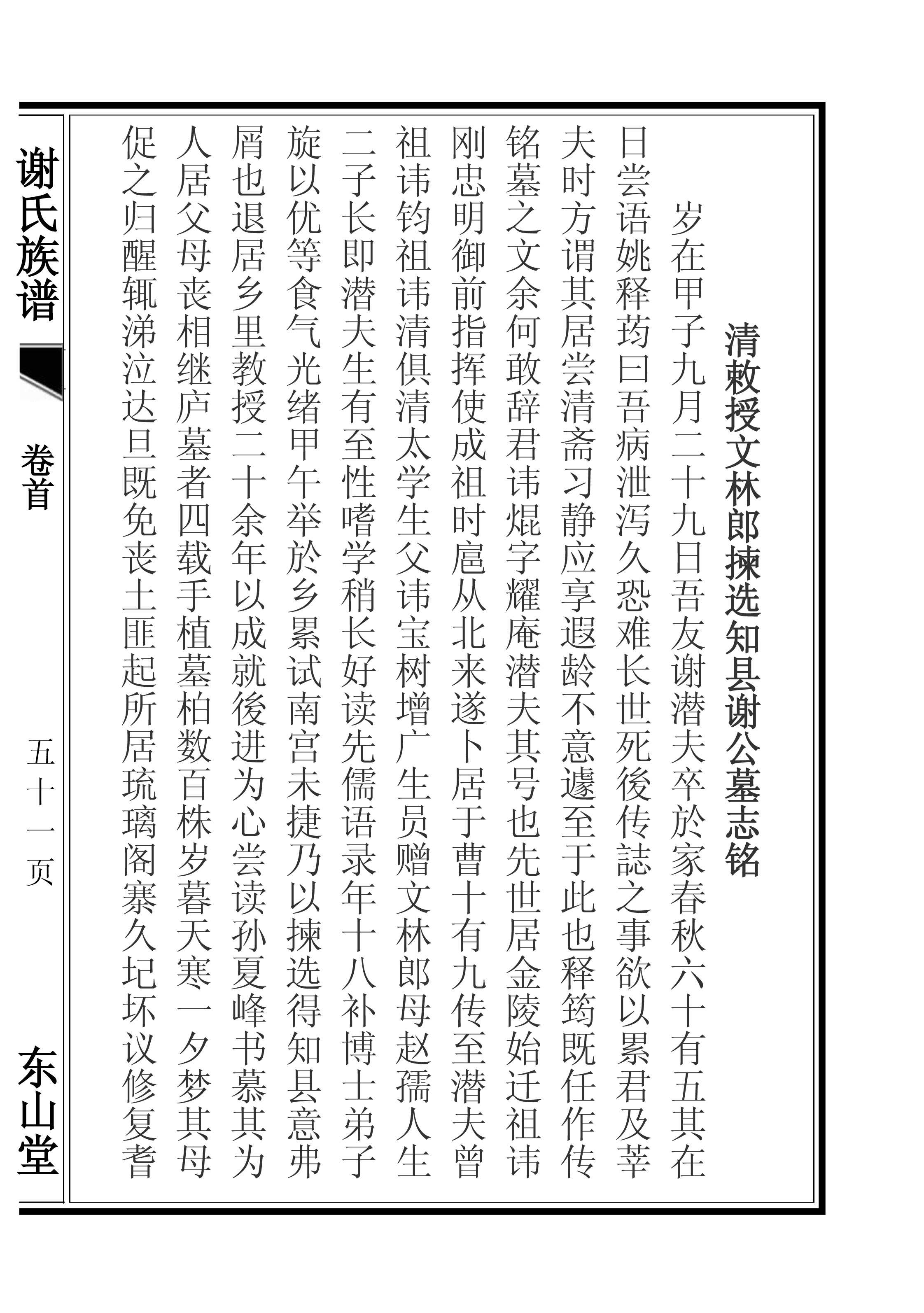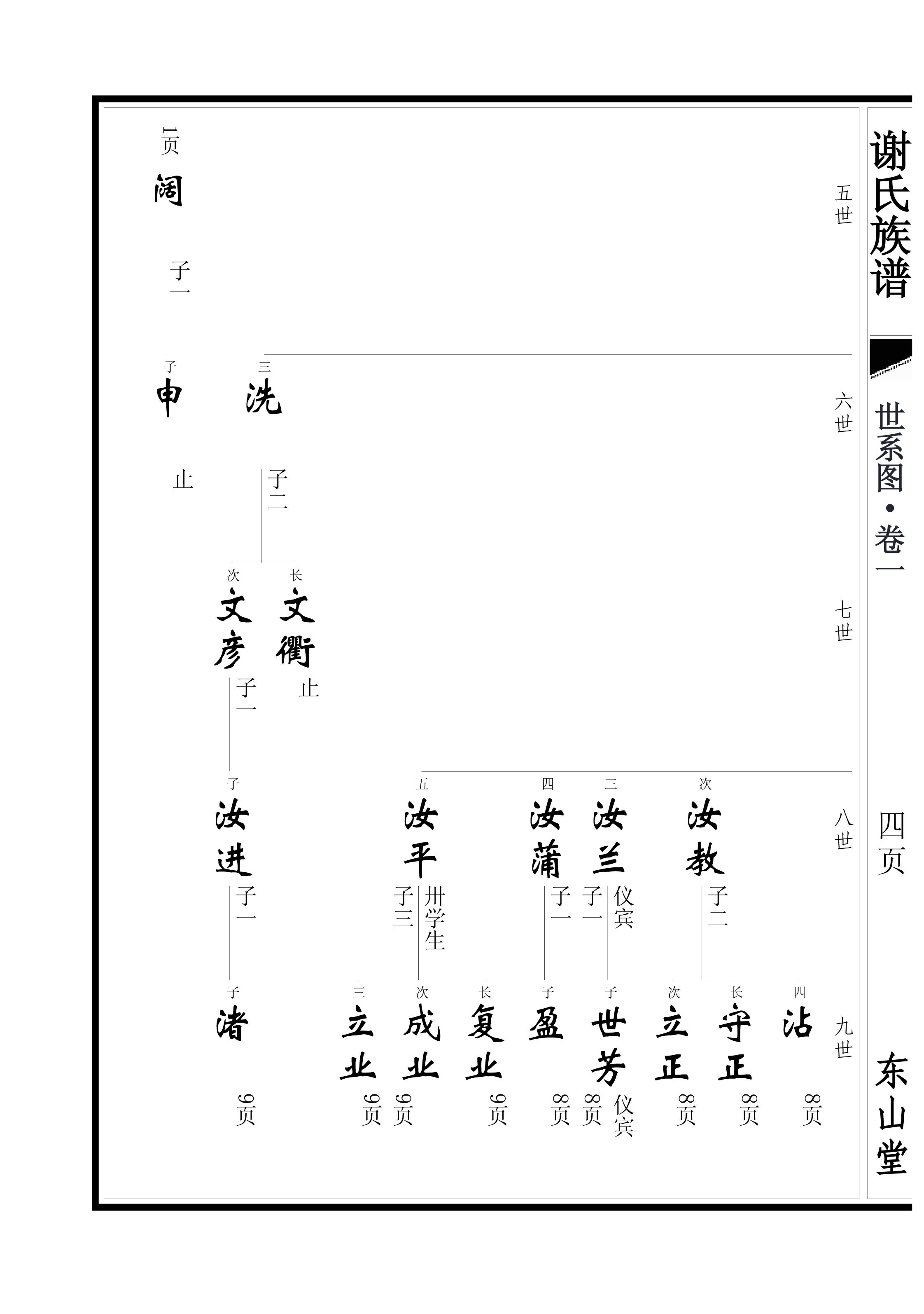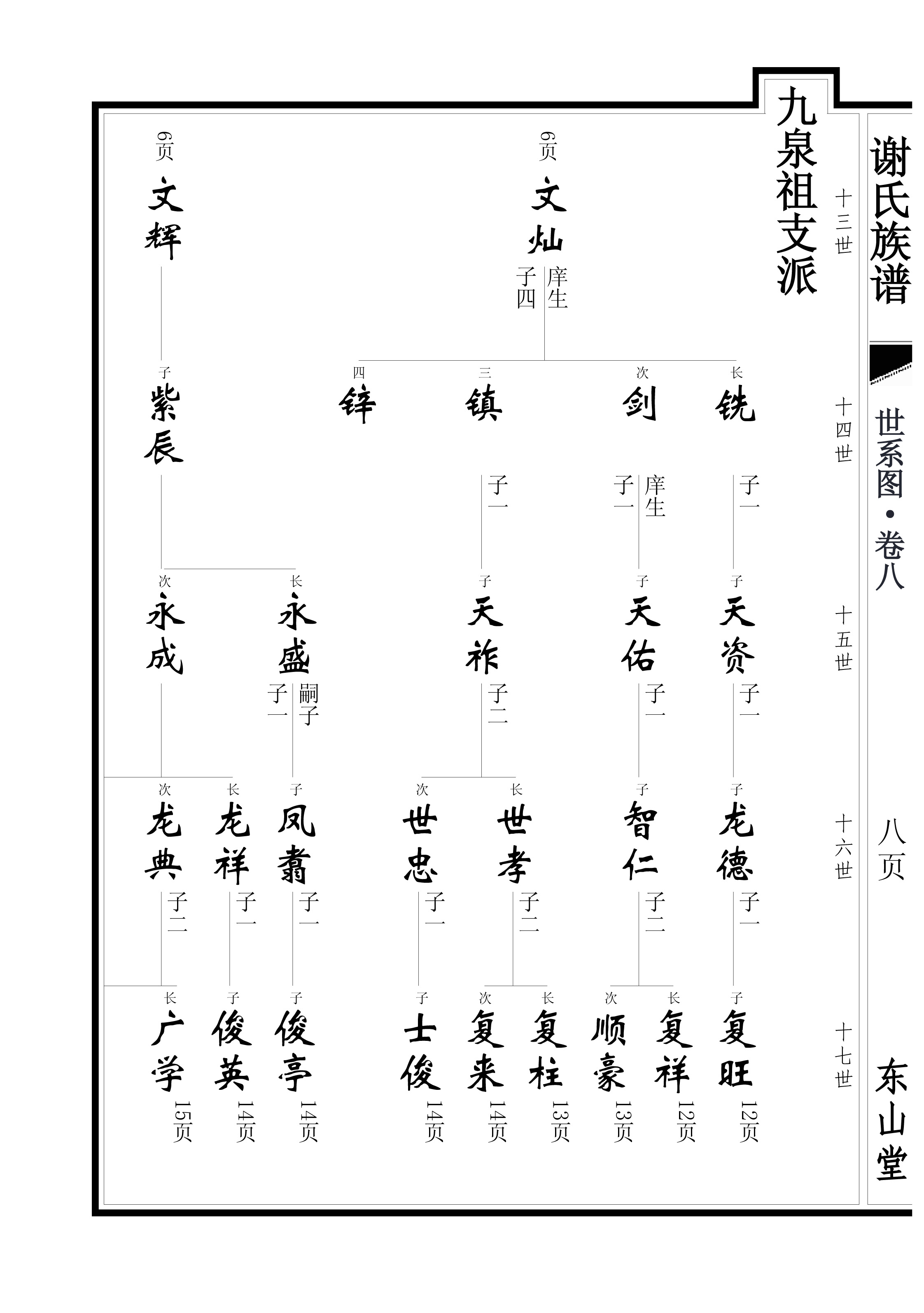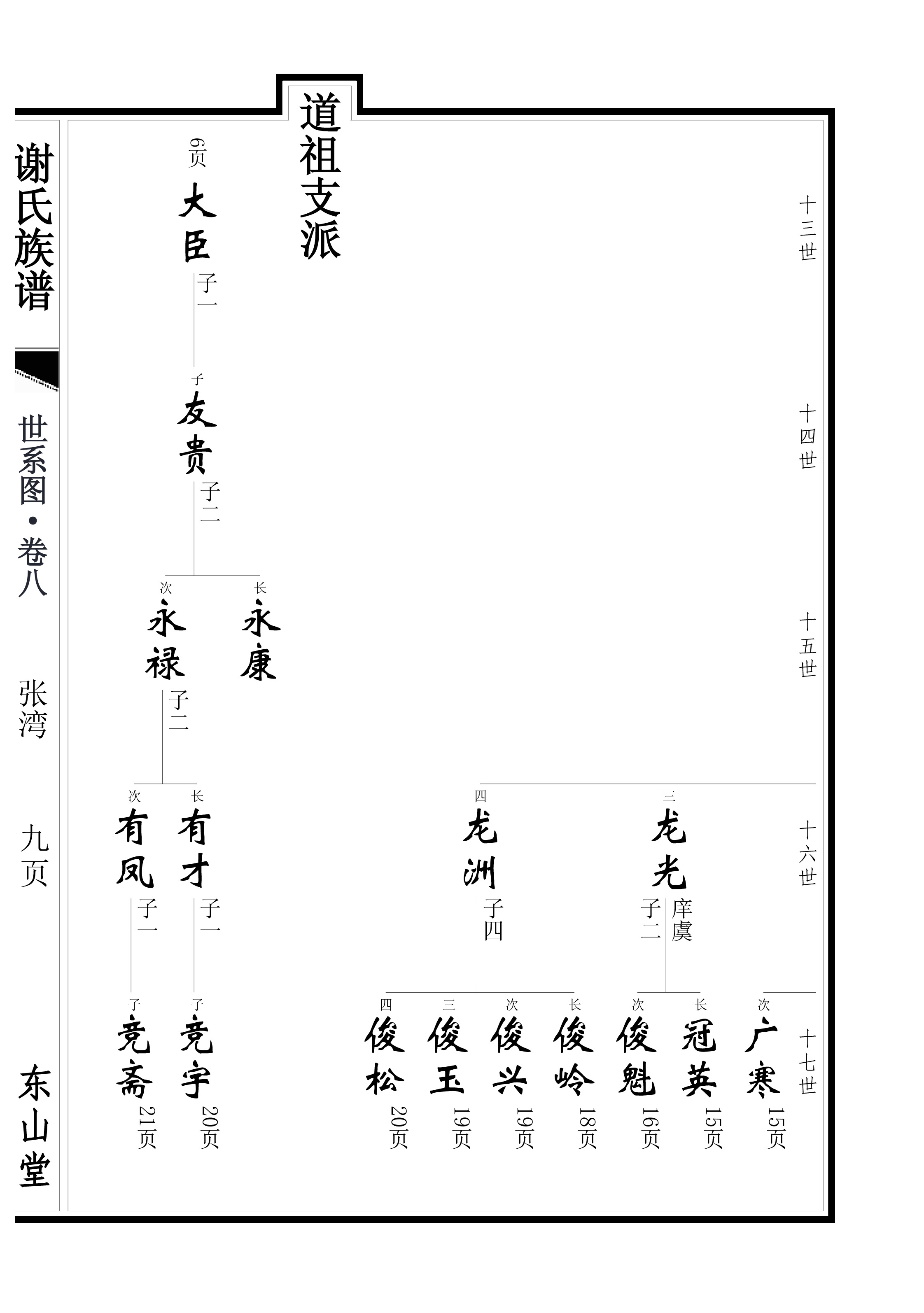主持人:谢新周,原曹县政府办公室主任。卷首内容分先祖像赞、谱说序言、碑铭祠记祭文、艺文志、谢氏家训、历次修谱人员等,其它各卷分述各支世系图。本谱样式系主要根据原谱样式设计,内容较为简单,只列出配偶及生子情况,或有功名者亦列出。每支开始列出其上第五世祖名讳,也等于是按五伏排序,每页最上和最下一世有上下链接页码,供查阅,分布设计采用吊线中置图,即父亲在兄弟中间。名字采用魏碑字体,典雅古朴,其它简介部分用宋体,清晰明朗。 ...