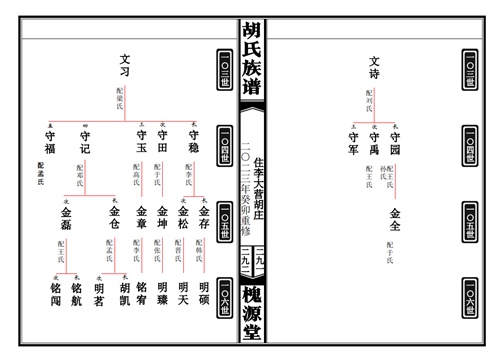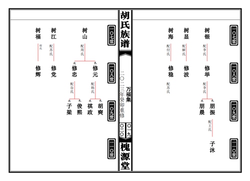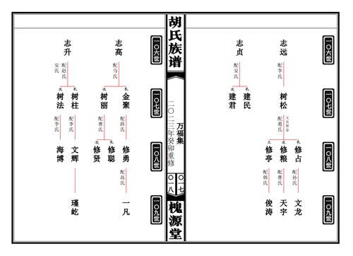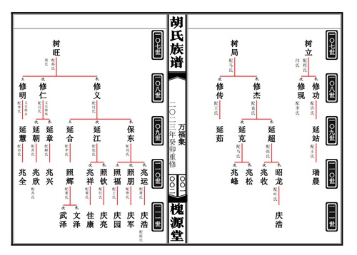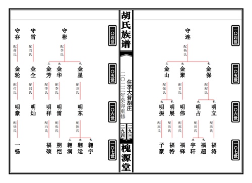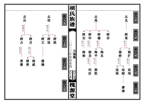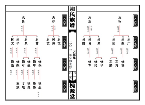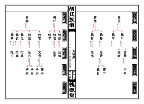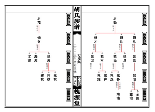 定陶半堤镇胡海胡氏族谱 序言曰:树木参天有其根,江河万里有其源。家族有谱,犹国之有史,方之有志。史可鉴古今,知兴衰,志可通资治,明教化;谱可辨支系,别长幼。况我胡氏一族历史悠久,国之大姓之一,族人遍布全国乃至海外,可谓人丁兴旺,才俊辈出。仅我槐源一支,就有族人七千多人,足称当地之旺族。而今,国家太平,族民殷实,又逢生育政策放开,生息繁衍出现高峰。 自上次续谱至今已二十余年。遵照族规,定于癸卯年接续。时值阳春,万物复苏,生机盎然,疫情遁迹,经济回暖,国运昌盛,举国开启百年新局之时,上遵先祖遗规,下应族人诉求,推举一百零七世树亭、效臣、树亮、学富,一百零八世修礼为编委,共理续谱事宜。肩负族人囑托,深感才疏学浅,难当重任。我们愿凭忠、孝、礼、仪之心,上尊祖宗,下慰族人,尽心尽责,敬终慎始,善成族谱修编。此次修编若有挂漏,俟异日编修者正之。 胡氏族谱于2023年编修,全一册,宣纸印刷,大16本,缎面包角仿古四眼线装,164个筒子页,45套,由胡修礼老师主持编修,族谱采用宝塔图谱式,对称美观。因此次修谱只补续,只对前几次的谱未收录的新人...