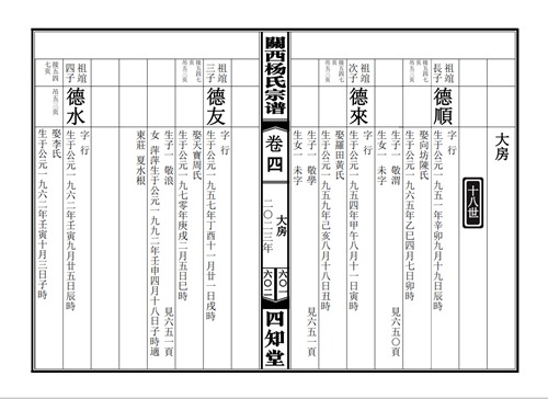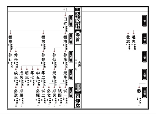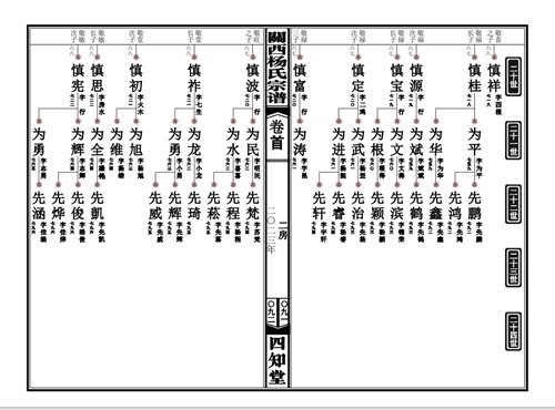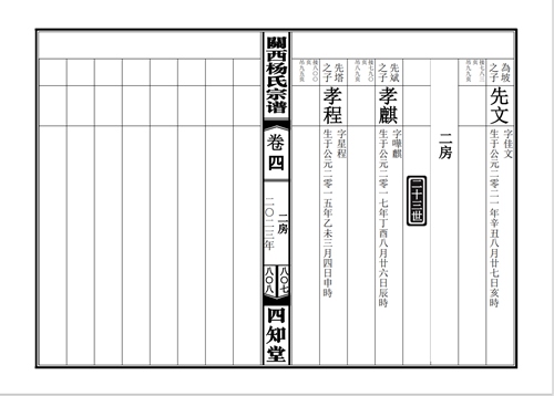 南昌安义县西关杨氏族谱 南昌安义西关杨氏为四知堂,四知源于《后汉书·杨震传》:"当之郡,道经昌邑,故所举荆州茂才王密为昌邑令,谒见,至夜怀金十斤以遗震。震曰:'故人知君,君不知故人,何也。'密曰:'暮夜无知者。'震 曰:'天知,神知,我知,子知。何谓无知。'密愧而出。“。族谱于2023年春续修,宣纸印刷,八开仿古线装,一套五卷,计406个筒子页。内容体例较全面,体现了南昌族谱的特点,前面安排世系,为五世吊线图。后面安排个人行传,按传统竖版样式排版,行传内容包括:某人几子、本人名讳、号、族排行、生卒年月日时、享年几何、葬于何地何向、配偶信息(何氏与生卒年月日时),生子生女信息。父亲姓名下有父亲所在页码,儿子姓名后有儿子们所在页码,吊线与行传都有互通页码,非常方便查找。 本次续修排版严谨,装订精细,为杨氏宗亲所赞誉。...