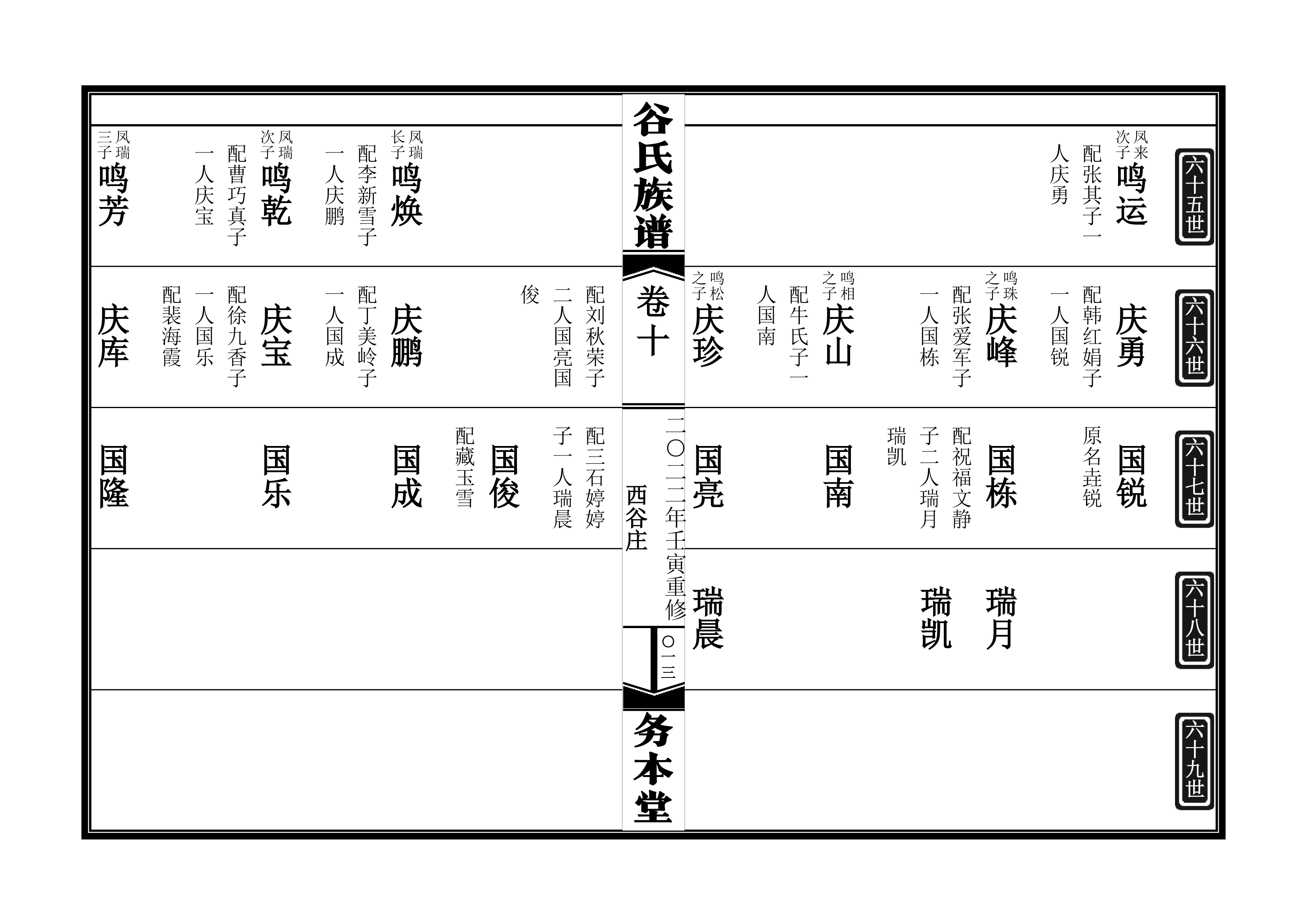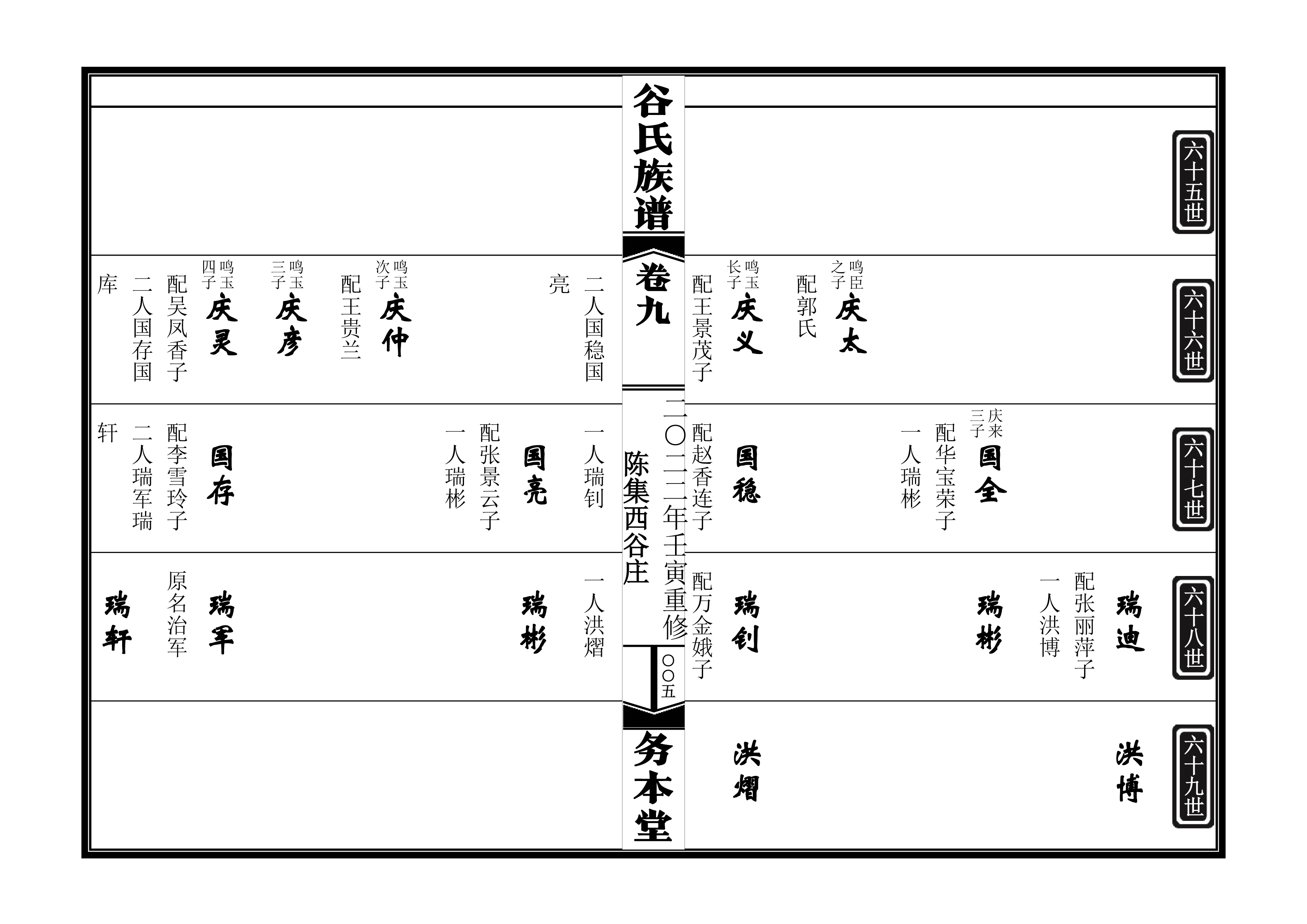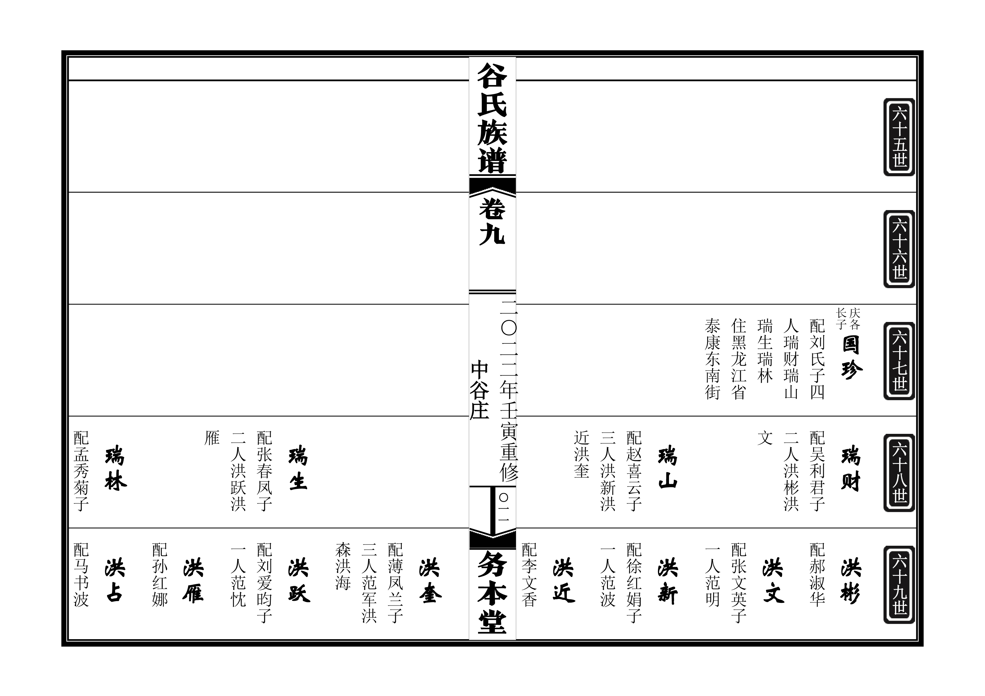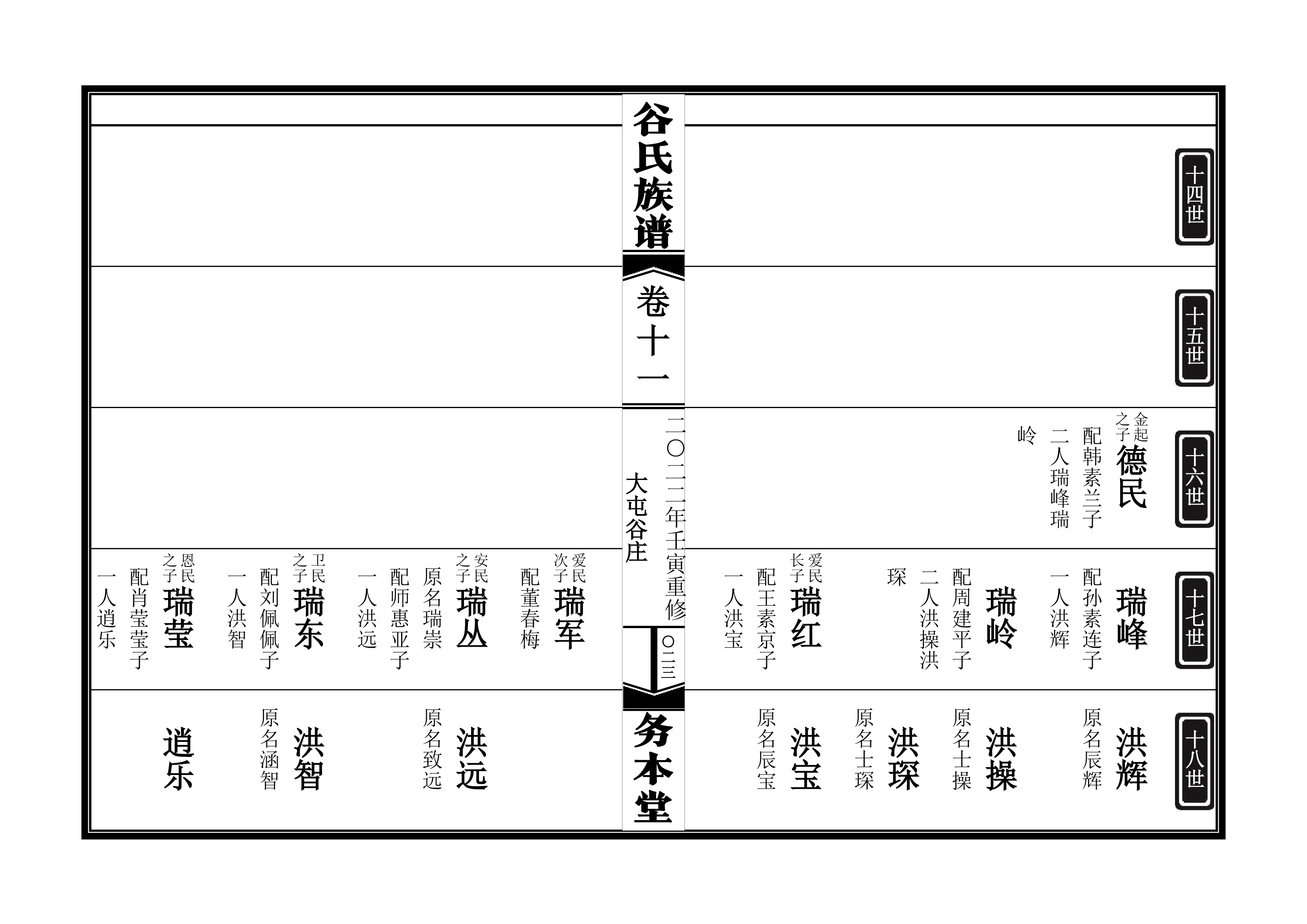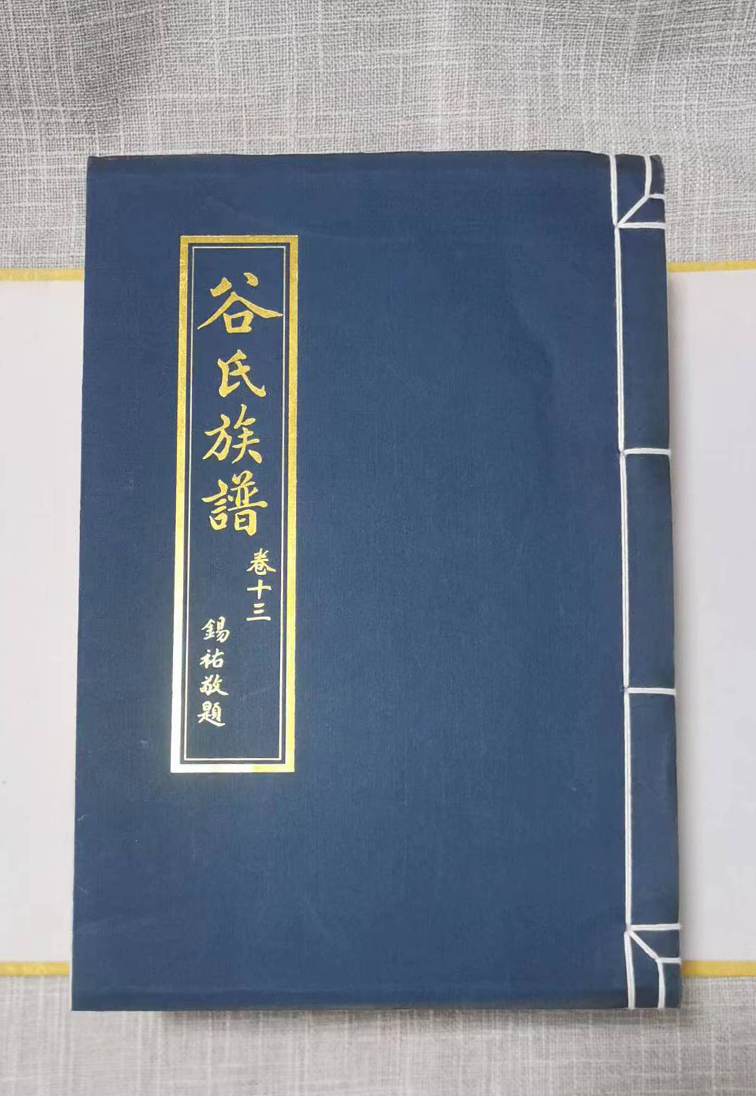 2018年续修,宣纸印刷,仿古线装,绫缎包角,共12卷,印数220套。由定陶陈镇谷庄谷主持编纂,收录定陶、曹县、兰考、鄄城、东明等地谷氏家族。谷氏谱格式属于欧式,每图五代,十代两图,谱载功名、配偶及生子情况,是根据原谱样式而定,不容更改。本套谱最大的特点是接续,即每次修四卷,前面修的不动,接续只增加原来未入谱的人丁,这样本来目的为减少工作量,但给整套谱查询带来较大不便,中间空白较多,不便翻阅。 详情: 2018年续修,宣纸印刷,仿古线装,绫缎包角,共12卷,印数220套。由定陶陈镇谷庄谷主持编纂,收录定陶、曹县、兰考、鄄城、东明等地谷氏家族。谷氏谱格式属于欧式,每图五代,十代两图,谱载功名、配偶及生子情况,是根据原谱样式而定,不容更改。本套谱最大的特点是接续,即每次修四卷...