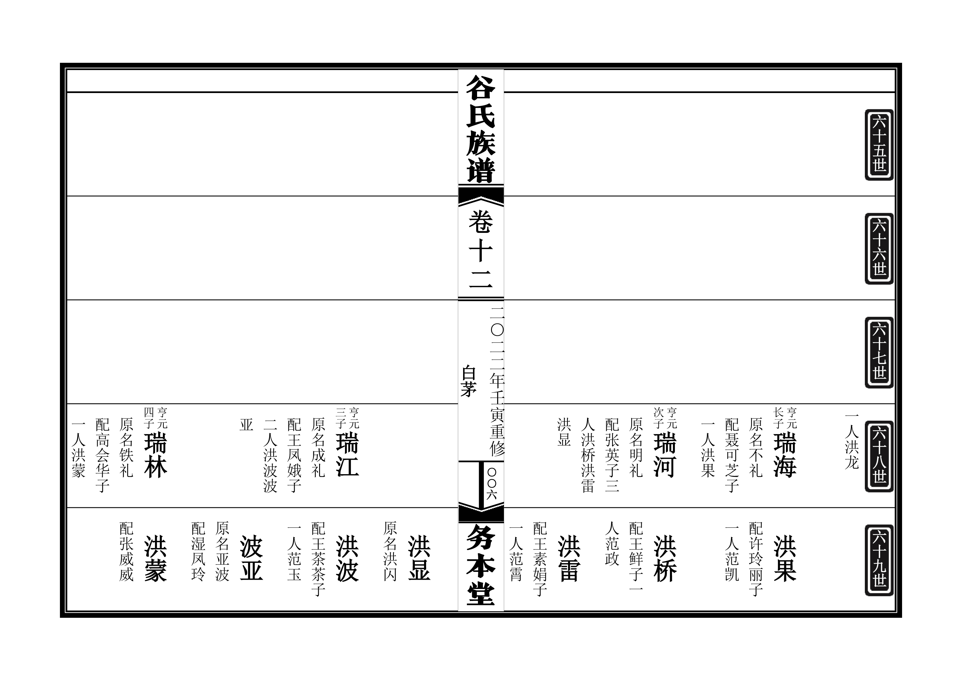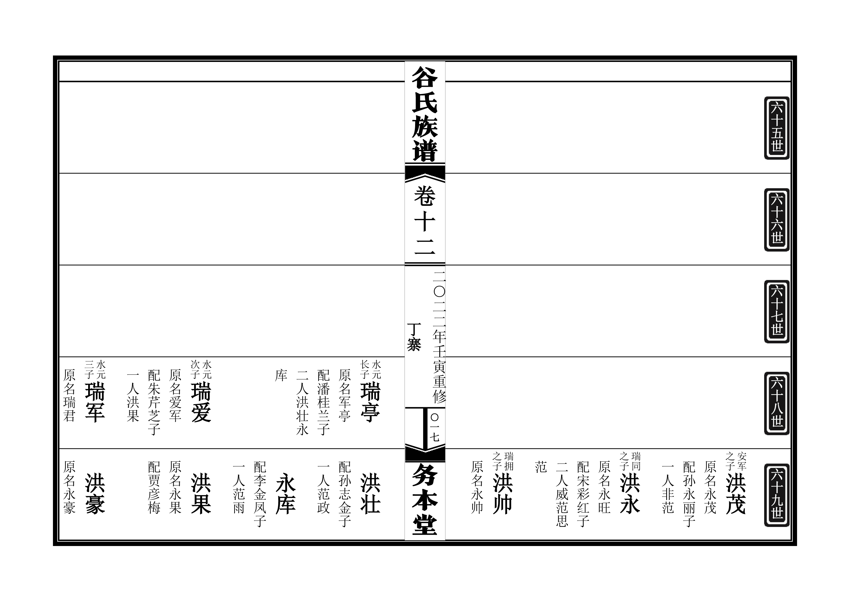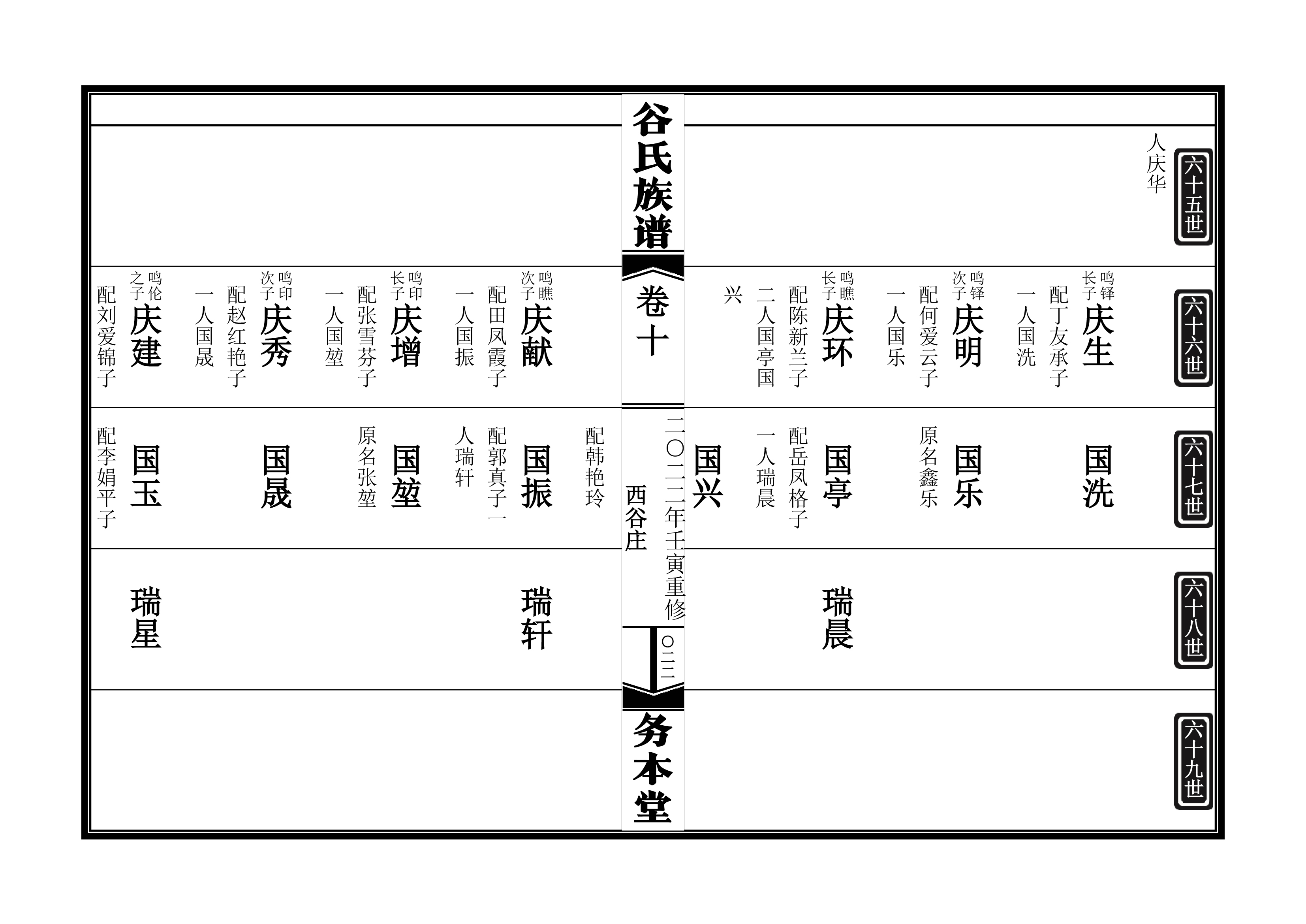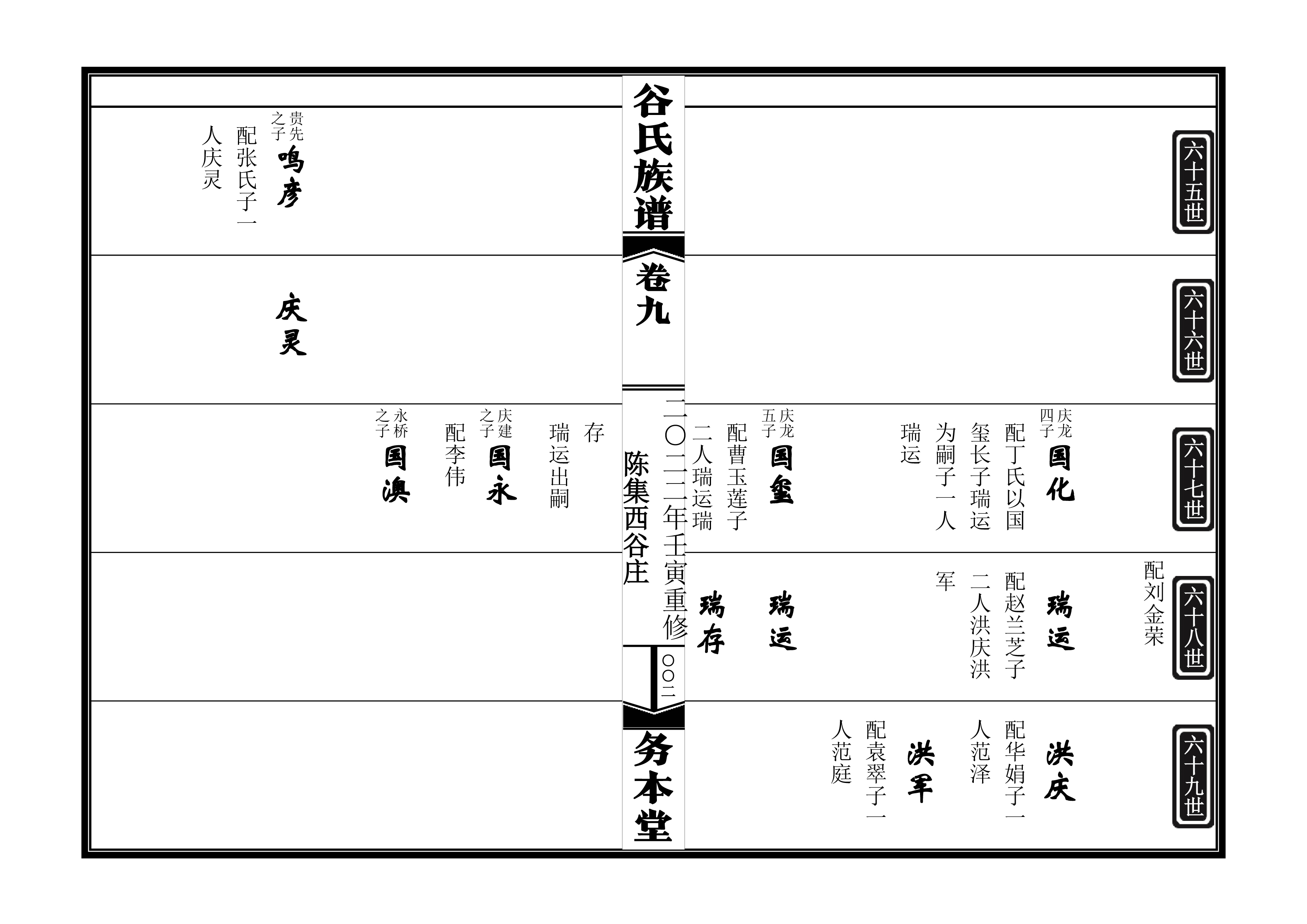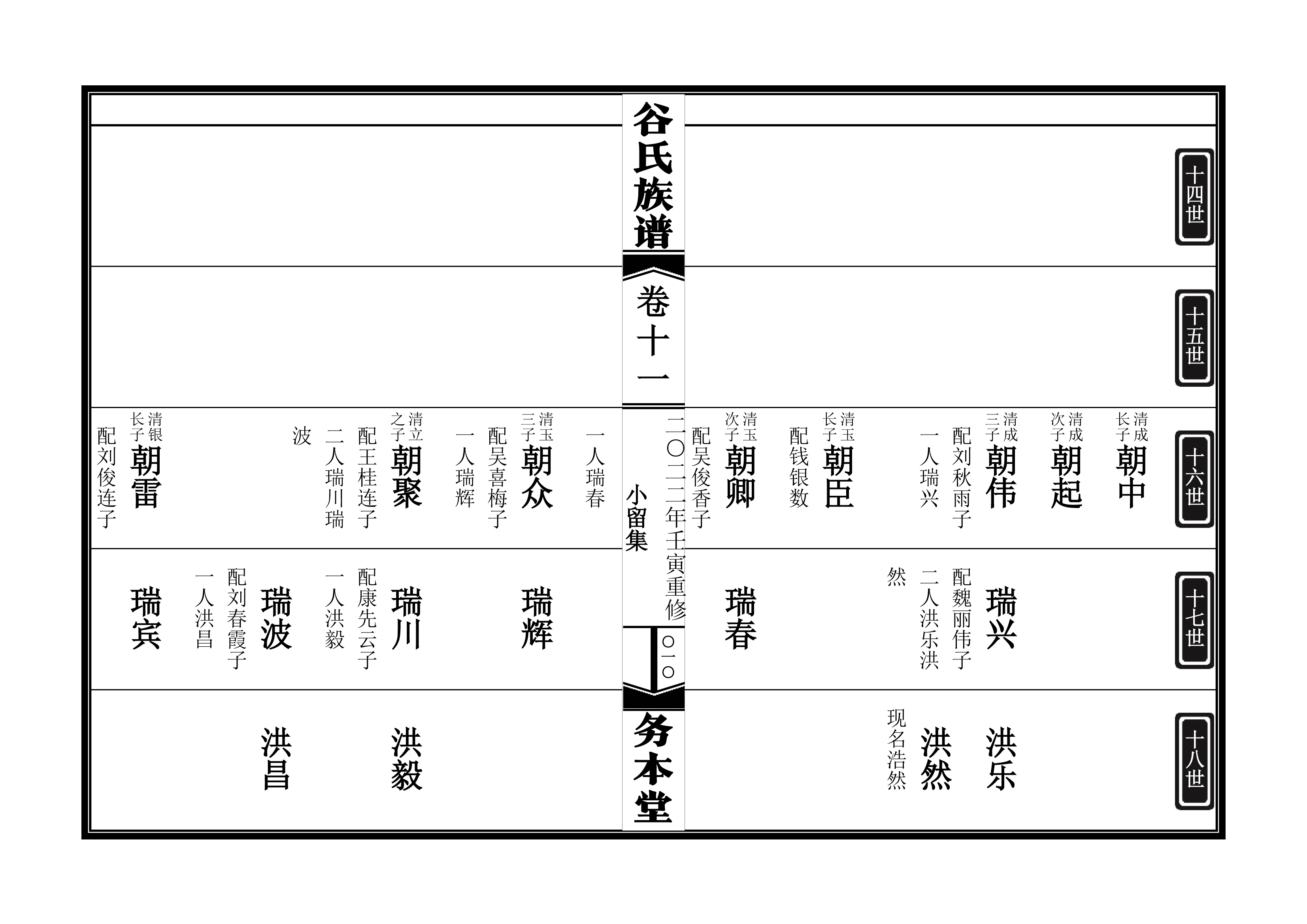 2018年续修,宣纸印刷,仿古线装,绫缎包角,共12卷,印数220套。由定陶陈镇谷庄谷主持编纂,收录定陶、曹县、兰考、鄄城、东明等地谷氏家族。谷氏谱格式属于欧式,每图五代,十代两图,谱载功名、配偶及生子情况,是根据原谱样式而定,不容更改。本套谱最大的特点是接续,即每次修四卷,前面修的不动,接续只增加原来未入谱的人丁,这样本来目的为减少工作量,但给整套谱查询带来较大不便,中间空白较多,不便翻阅。 详情: 2018年续修,宣纸印刷,仿古线装,绫缎包角,共12卷,印数220套。由定陶陈镇谷庄谷主持编纂,收录定陶、曹县、兰考、鄄城、东明等地谷氏家族。谷氏谱格式属于欧式,每图五代,十代两图,谱载功名、配偶及生子情况,是根据原谱样式而定,不容更改。本套谱最大的特点是接续,即每次修四卷...