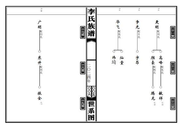 李氏族谱采用常用的吊线中置样式,每图三代,上下各有链接页码,世数标签下附有排行字。宣纸印刷,成品规格为26乘16。显得非常美观,值得珍藏。