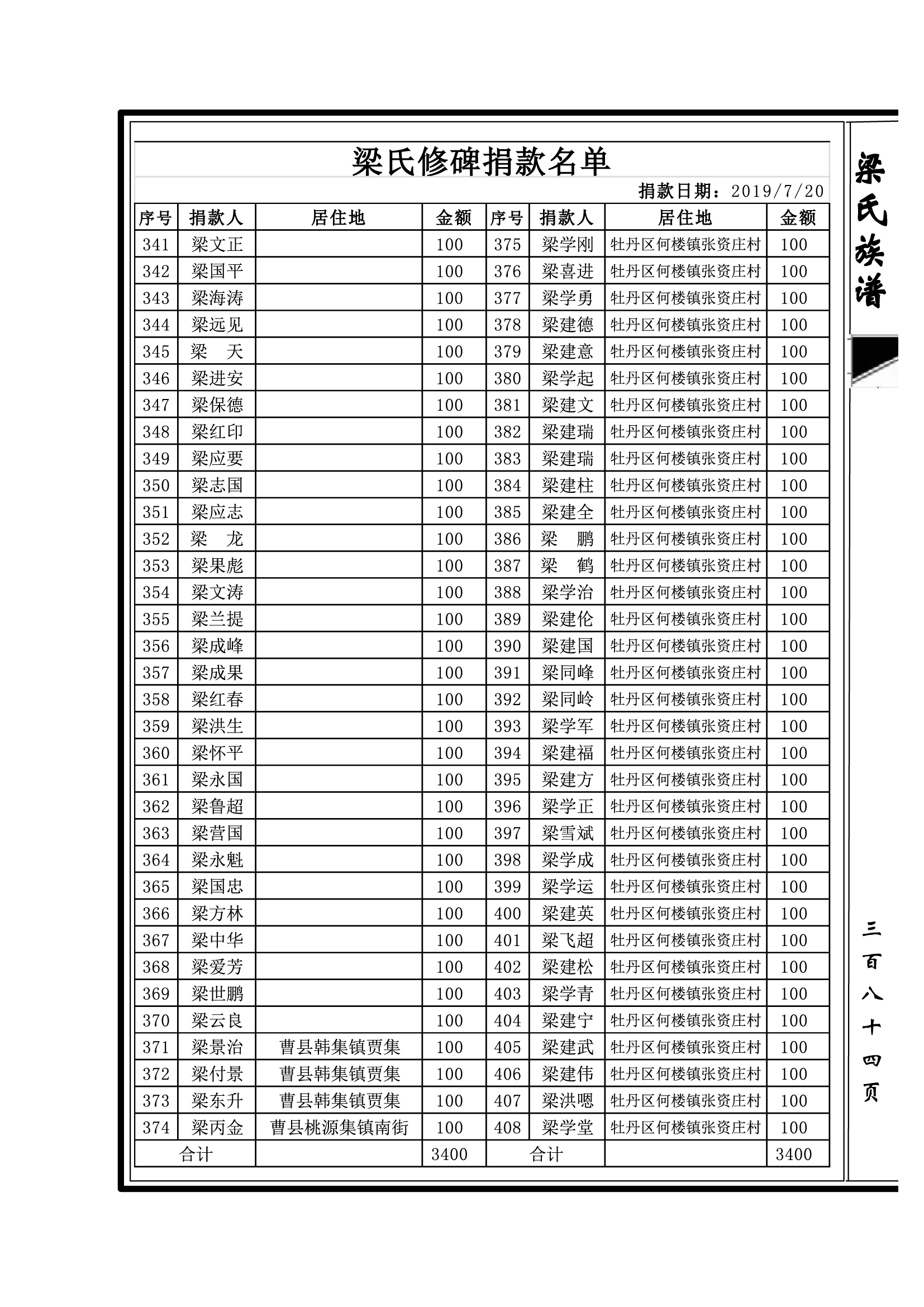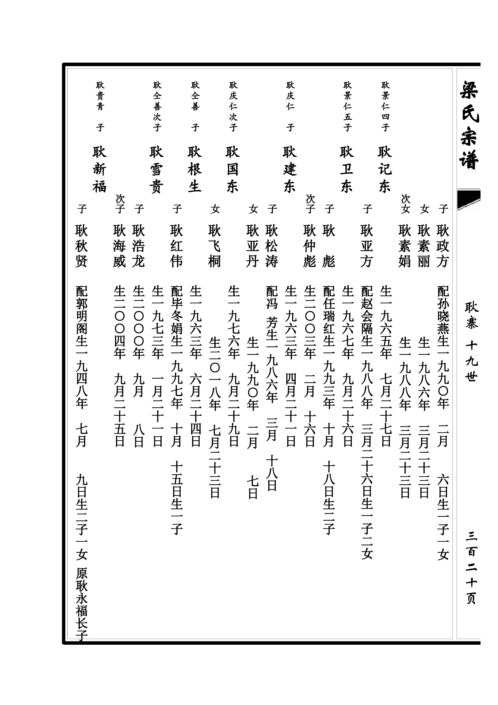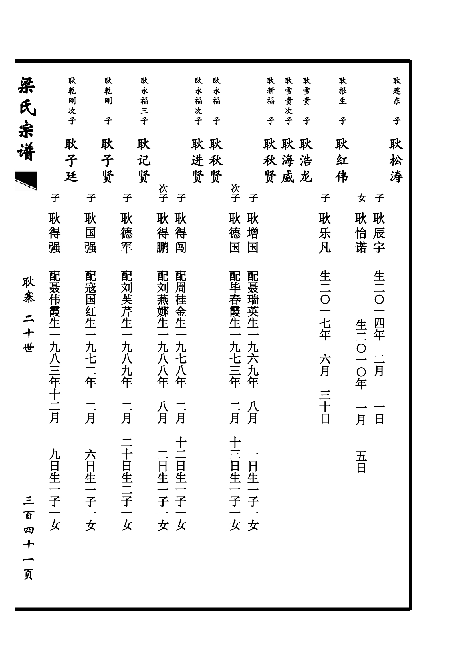 2020年编修,大16开本,锁线精装,386页,200套。主持人梁国民等。内容有序言、始祖墓碑及碑文、理事会成员、续谱说明,世系、后记、余庆录等。本谱有几个特点:一是谱名是“梁氏族谱”,可后面三分之一的世系是耿氏人丁,谱载耿氏这一支是住亲戚家,后来改为迁入村的姓;二是族谱格式,宗新要求较为严格,每条录入,谁人几子,长子只 写“子”,其它要写下排行,如“三子”,没排行的要空出一格,使“子”字对齐,然后下写姓名,下面录入出生年月日,换行录入子女,子女录入配偶及配偶的出生年月日,并写上生子女情况,下面的年月日都要求对齐。客户就是上帝,怎么要求怎么好。...