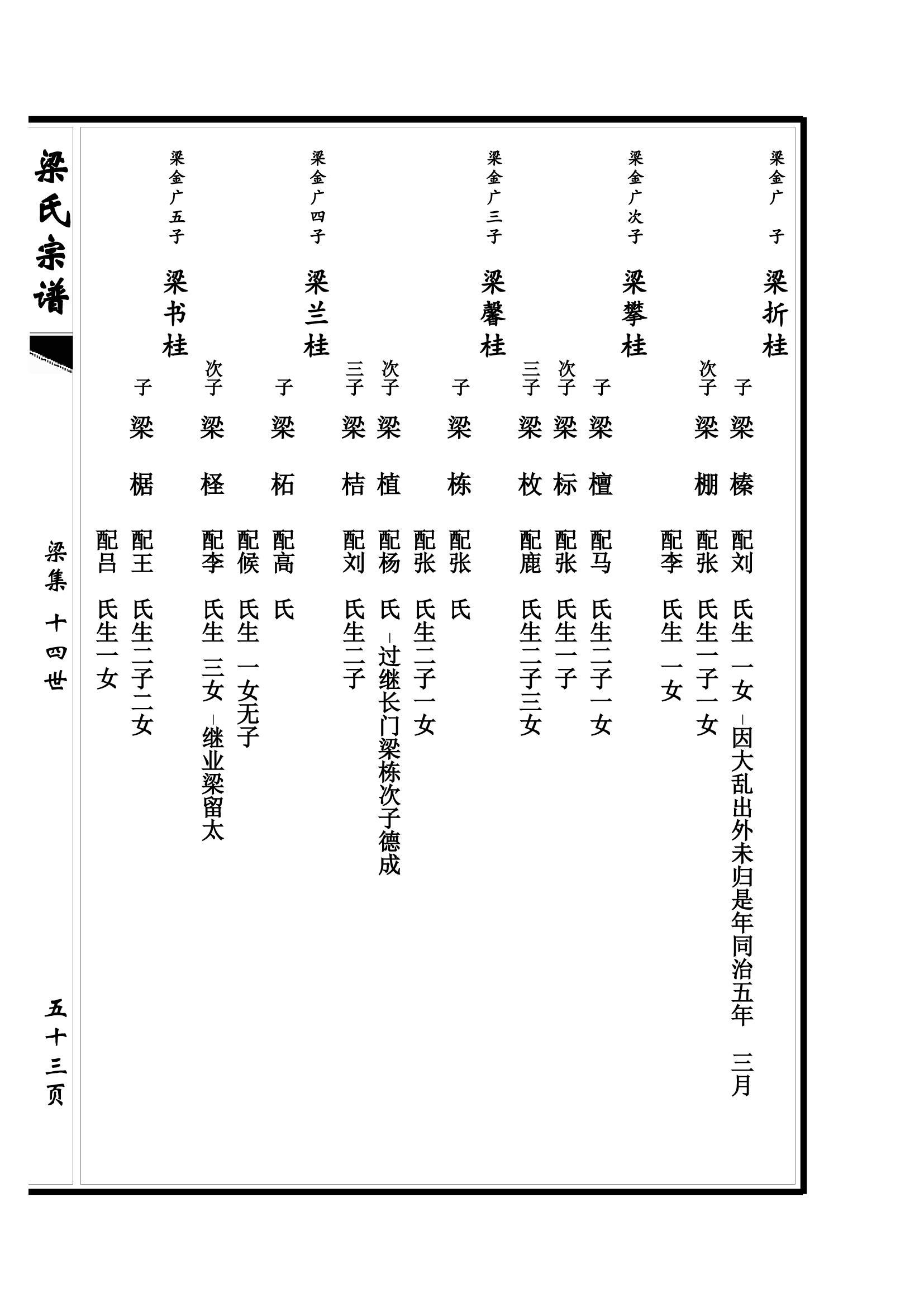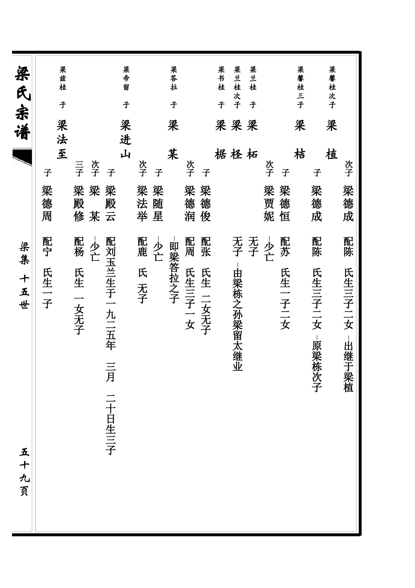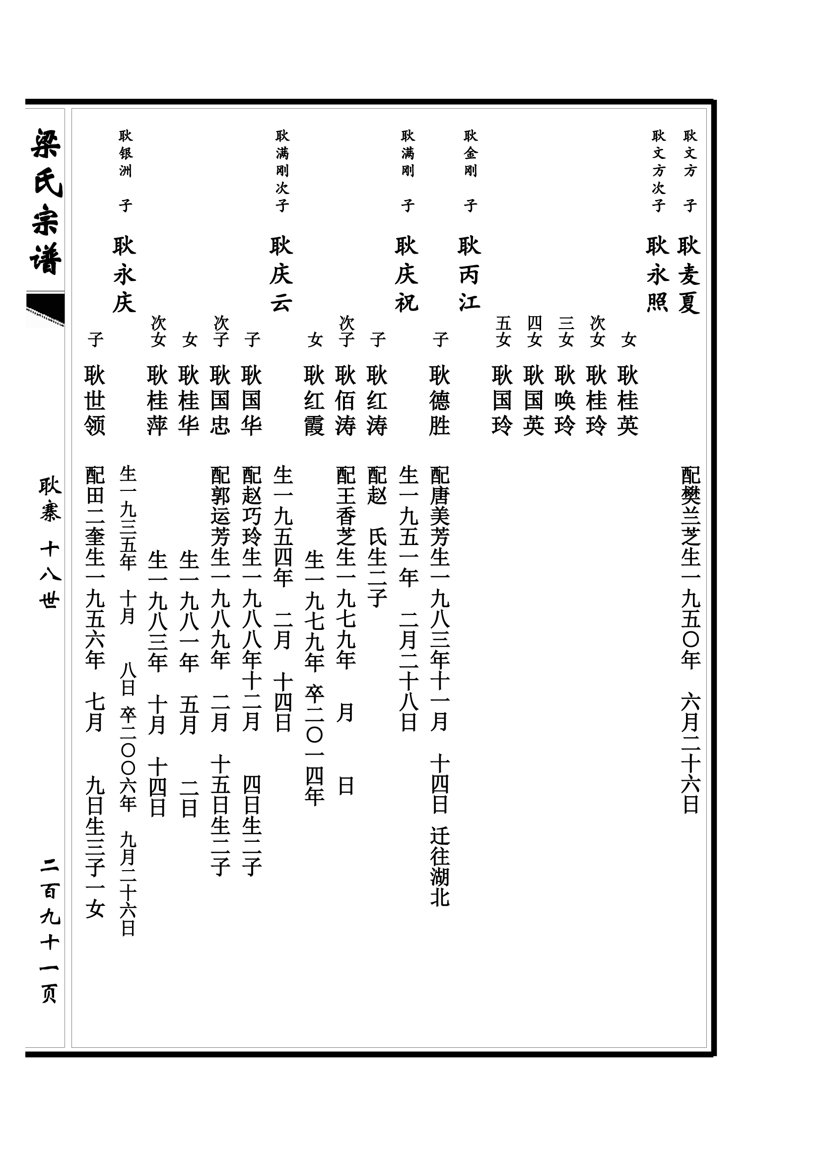 2020年编修,大16开本,锁线精装,386页,200套。主持人梁国民等。内容有序言、始祖墓碑及碑文、理事会成员、续谱说明,世系、后记、余庆录等。本谱有几个特点:一是谱名是“梁氏族谱”,可后面三分之一的世系是耿氏人丁,谱载耿氏这一支是住亲戚家,后来改为迁入村的姓;二是族谱格式,宗新要求较为严格,每条录入,谁人几子,长子只 写“子”,其它要写下排行,如“三子”,没排行的要空出一格,使“子”字对齐,然后下写姓名,下面录入出生年月日,换行录入子女,子女录入配偶及配偶的出生年月日,并写上生子女情况,下面的年月日都要求对齐。客户就是上帝,怎么要求怎么好。...