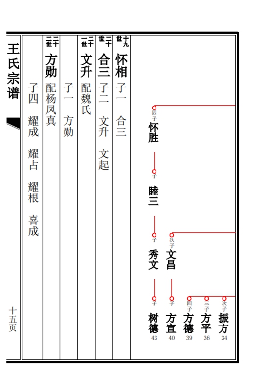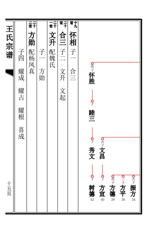 族谱采用吊线与行传两种样式,相互融合,在一页上先排成吊线图,紧接着列出员线中长支的人名的具体信息,包括配偶生子等,再把长支长门的吊线排出来,接着排长支长门的行传信息,依次类推。这种样式较不多见,但也有较多优势,世系与行传多在一起,便于查询。