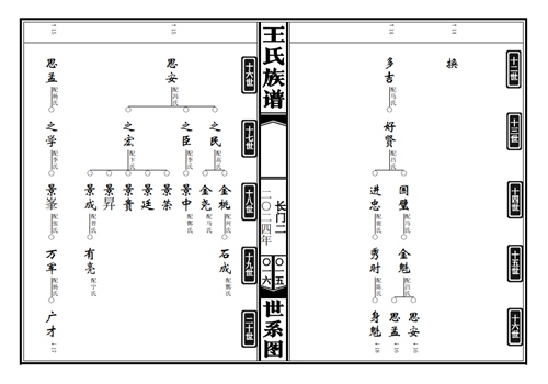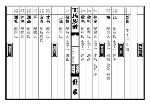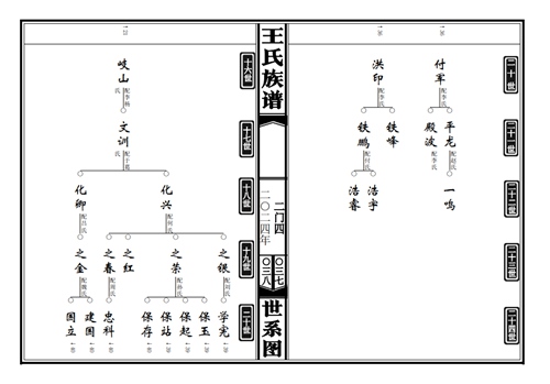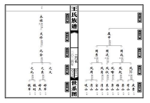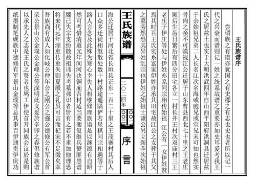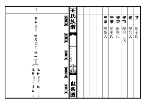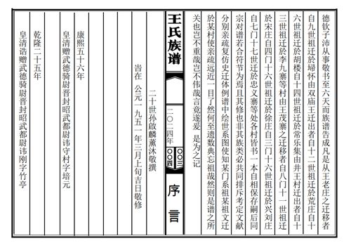 定陶冉堌镇田氏族谱 王氏族谱序言云:此支王氏于大明洪武四年自山西洪洞县迁居兹地,始祖兄弟二人,长曰江次曰海,或兄弟或堂兄未可知也,江公居曹县西北七十里王老庄,生齿日繁,后有四分田宅各立一村,长井王村,次双庙村,三王老庄,婿伊公于伊庄。 2024年南王家一支成心修谱,成立族谱编修理事会。前几世世系紊乱,父子关系不清,采用行传样式,至八世起父子关系清楚,故采用吊线图,便于查阅。名讳用魏碑字体,挺拔有气势,注释用宋宋体,庄重而清晰。印刷用38克宣纸,大16本,缎面六目仿古线装,全一卷,由77779193永利排版印制,于二○二四年四月请谱。 ...