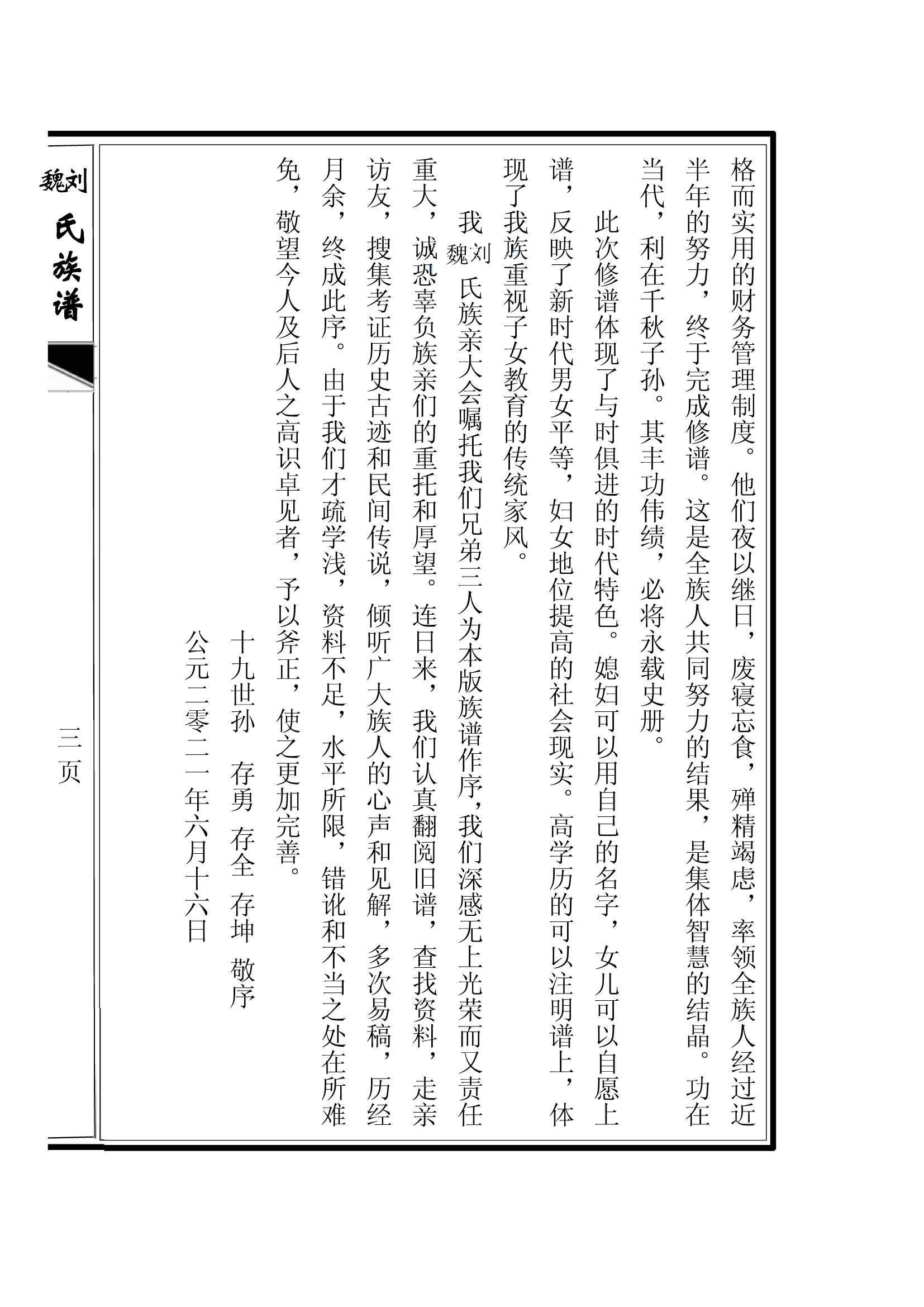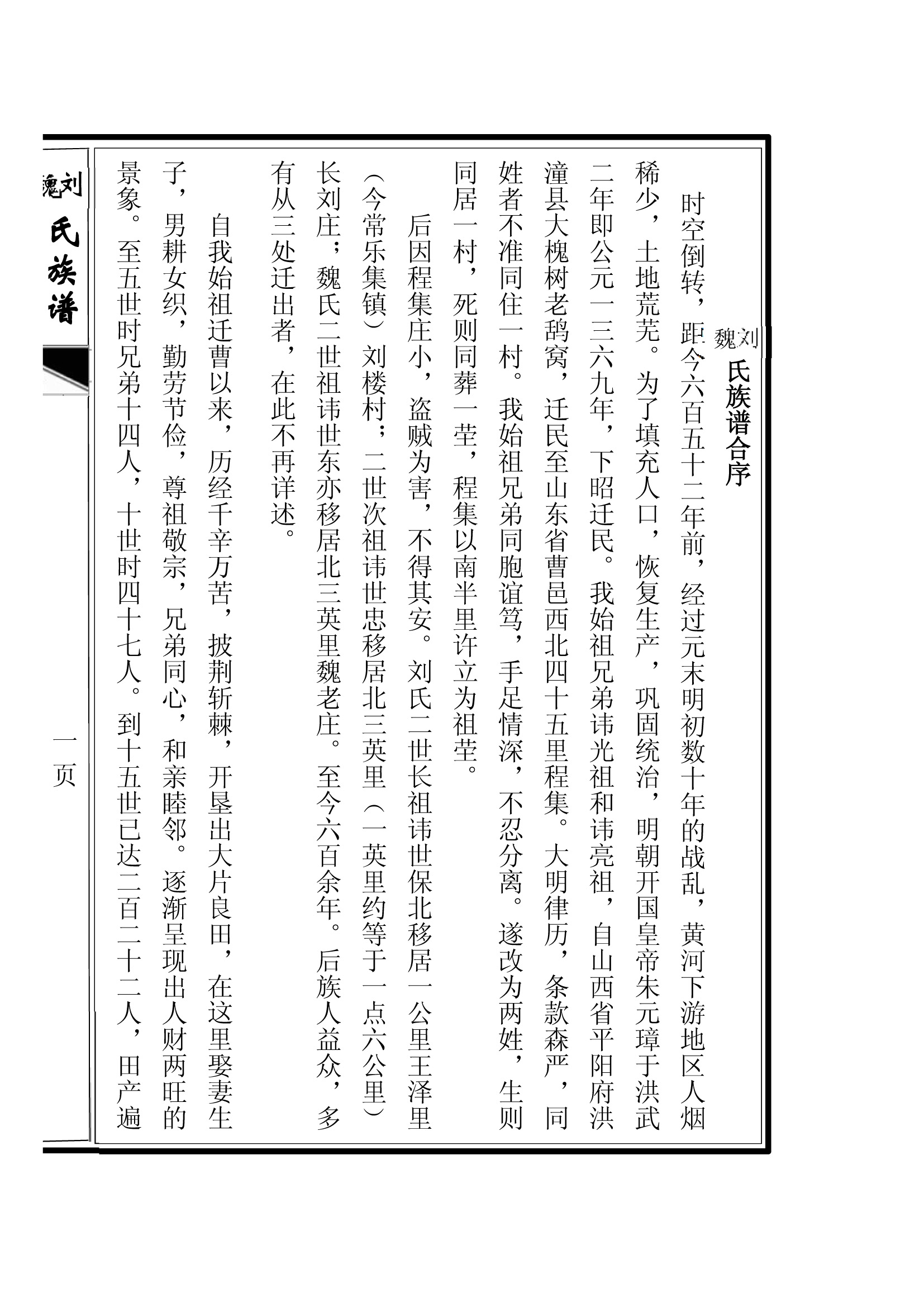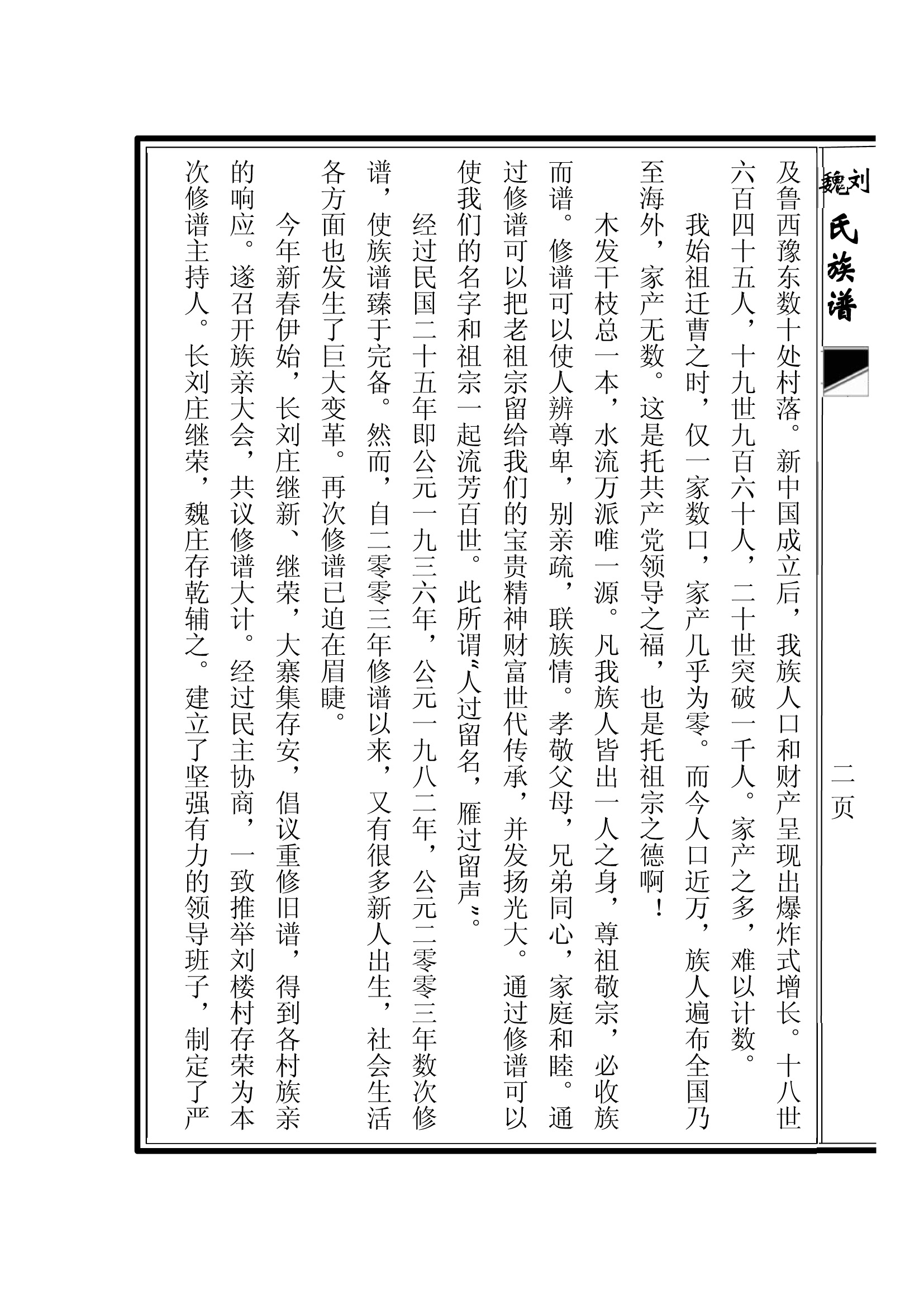 2021年编修,16开本,锁线精装,806页,120本。族众分布于曹县、兰考、民权多地。至于刘魏合修族谱原由,序言部分有载:我始祖兄弟讳光祖和讳亮祖,自山西省平阳府洪潼县大槐树老鸹窝,迁民至山东省曹邑西北四十五里程集。大明律历,条款森严,同姓者不准同住一村。我始祖兄弟同胞谊笃,手足情深,不忍分离。遂改为两姓,生则同居一村,死则同葬一茔,程集以南半里许立为祖茔。族谱样式采用北方经典的吊线图,谷称葡萄续样式,较为适应北方入谱内容简单,世系清楚易查的特点。字体用宋体,简明而古朴。 ...