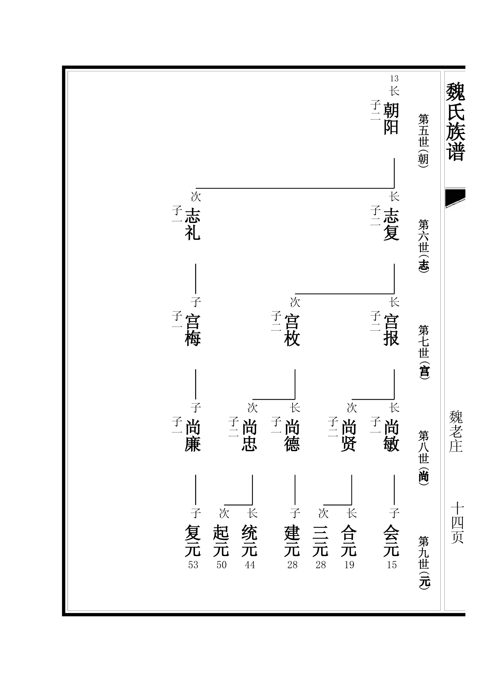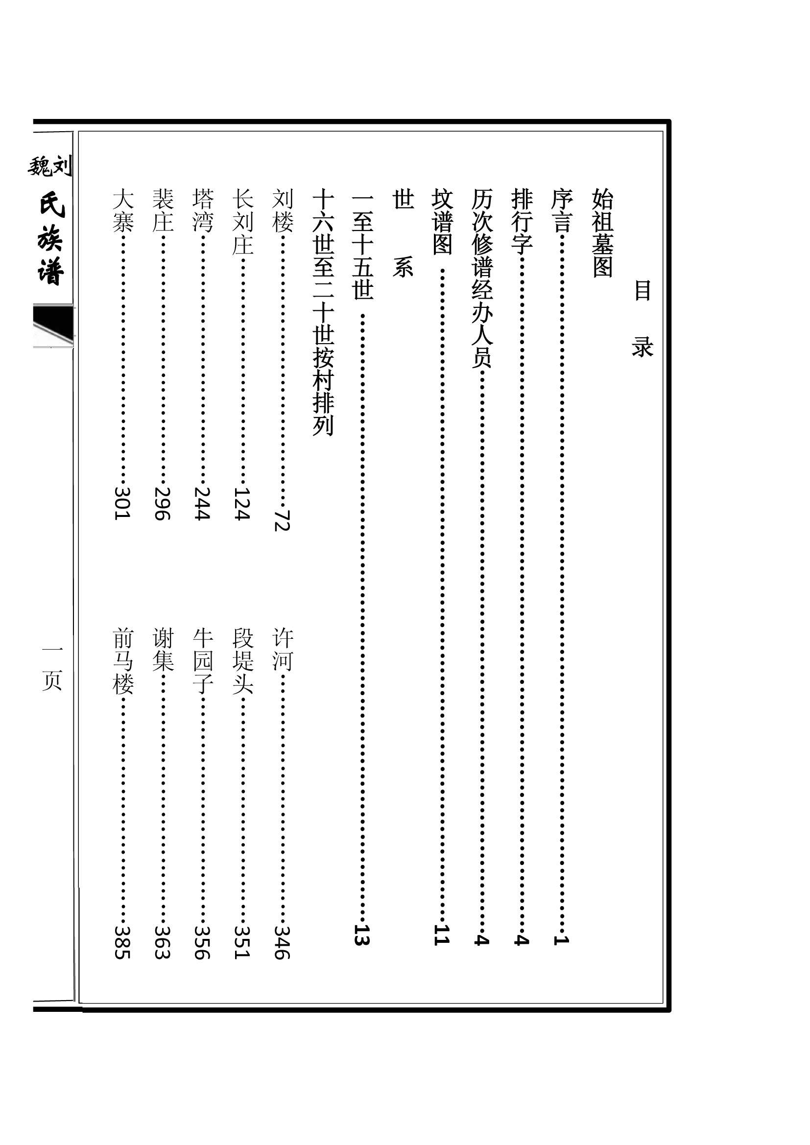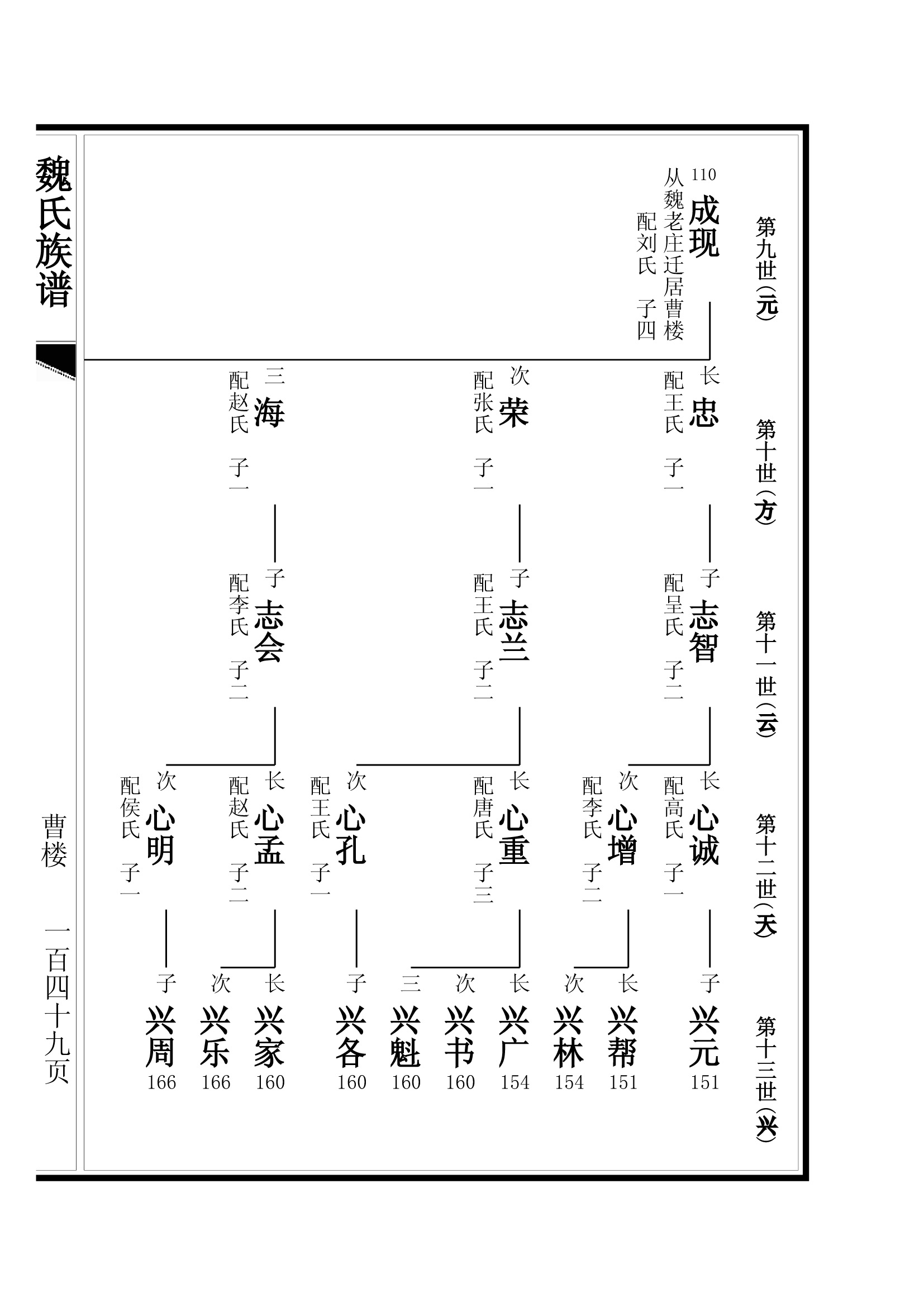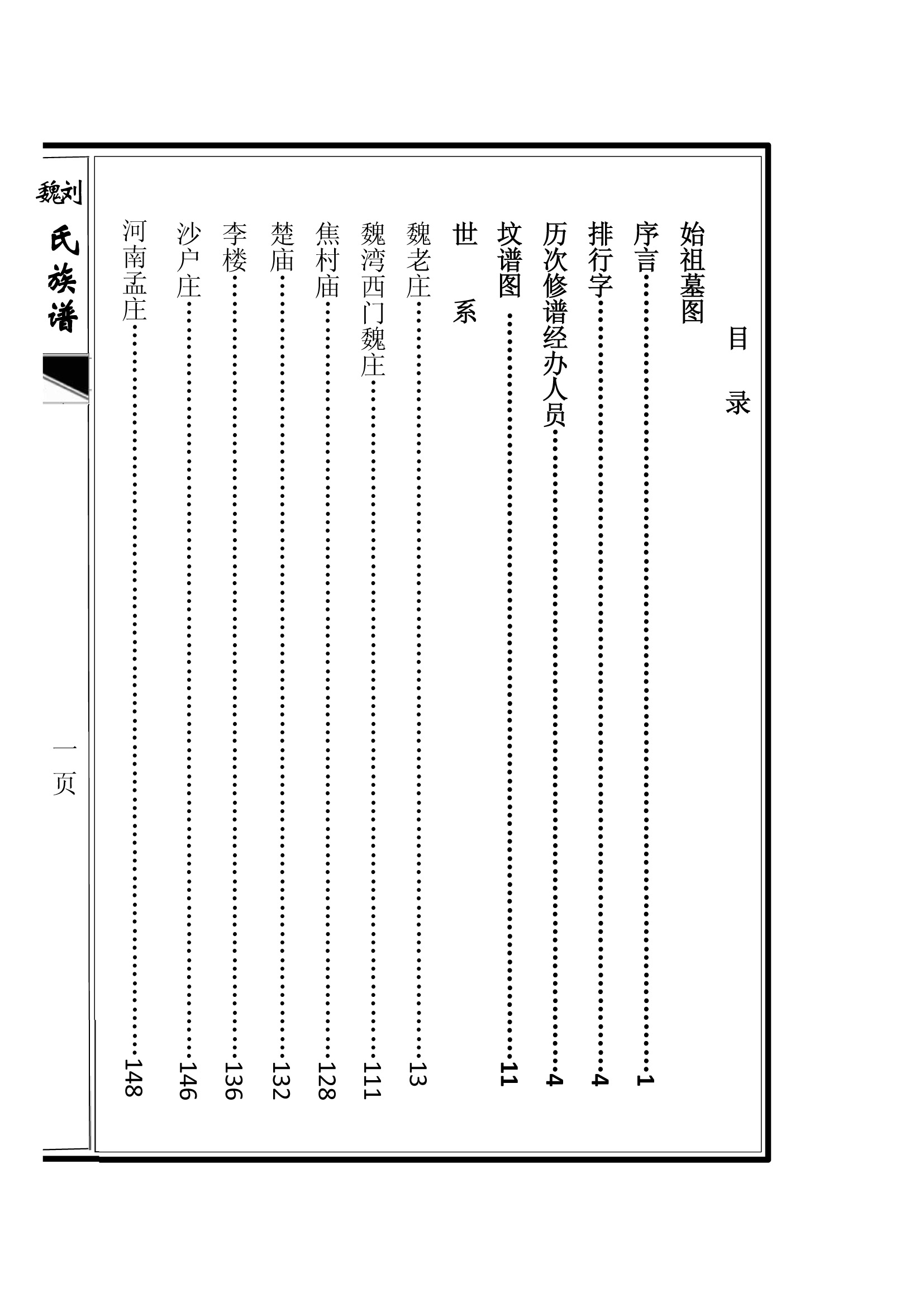 2021年编修,16开本,锁线精装,806页,120本。族众分布于曹县、兰考、民权多地。至于刘魏合修族谱原由,序言部分有载:我始祖兄弟讳光祖和讳亮祖,自山西省平阳府洪潼县大槐树老鸹窝,迁民至山东省曹邑西北四十五里程集。大明律历,条款森严,同姓者不准同住一村。我始祖兄弟同胞谊笃,手足情深,不忍分离。遂改为两姓,生则同居一村,死则同葬一茔,程集以南半里许立为祖茔。族谱样式采用北方经典的吊线图,谷称葡萄续样式,较为适应北方入谱内容简单,世系清楚易查的特点。字体用宋体,简明而古朴。 ...