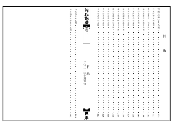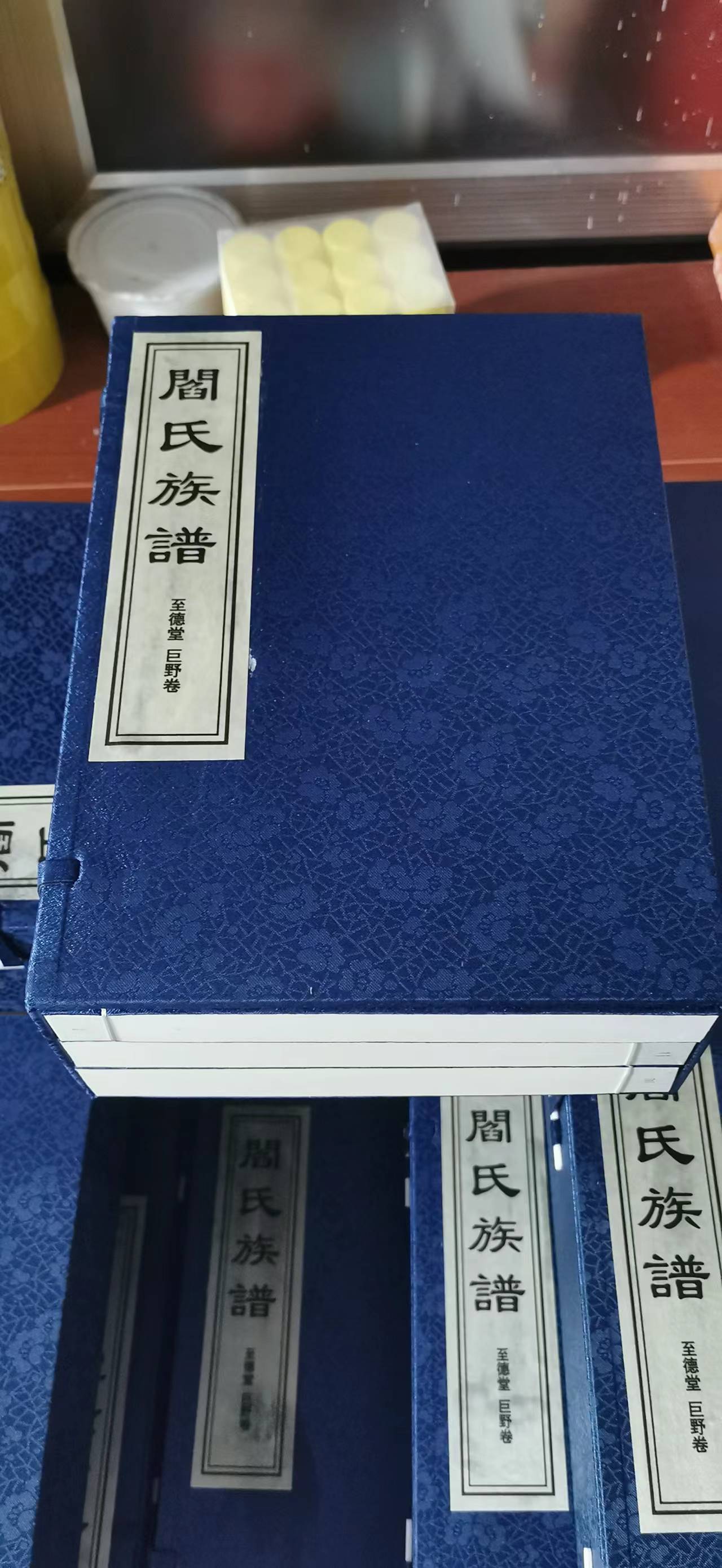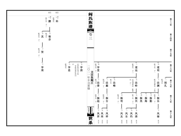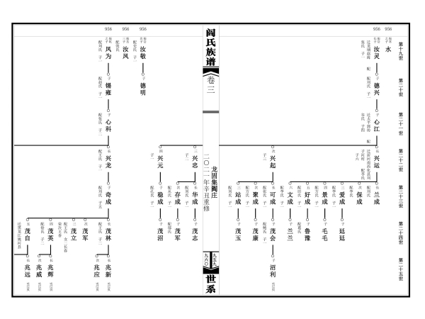 主编阎和彪,大义镇政府工作人员。本谱样式根据原谱设计,内容较详尽,谱载配氏何村何人几女,生女虽不挂线,但载嫁何村何门,世系采用经典吊线图,按家家清排序,七世一图,十五世两图,图图衔接,另加上下链接页码,便于查找。字体皆用宋体,古朴典雅。 后又增200套,采用无线胶装,一套两本,996页,于2022年11月成谱。