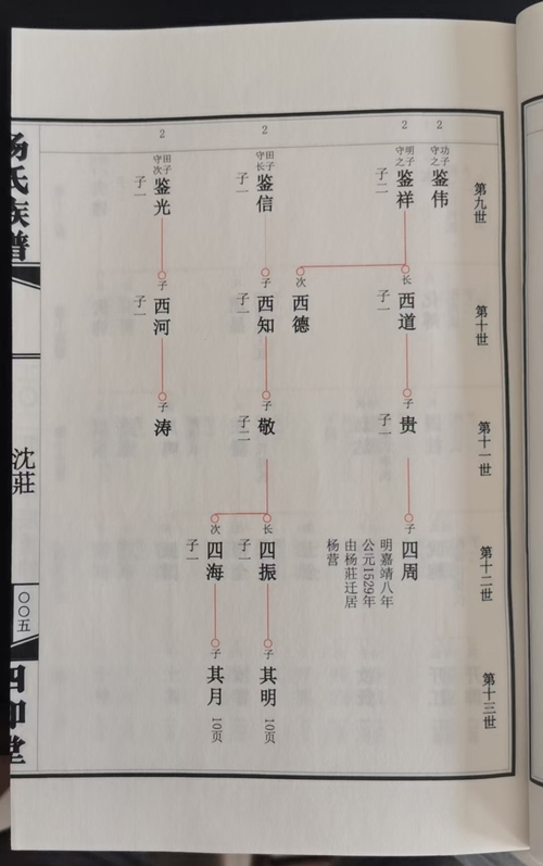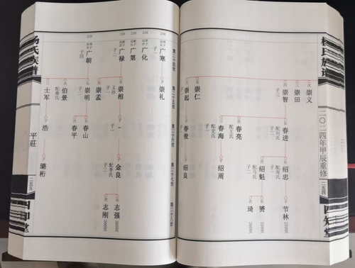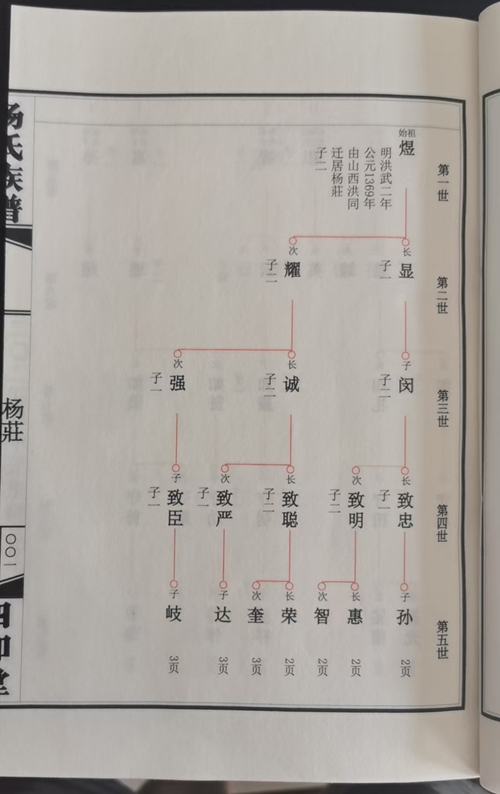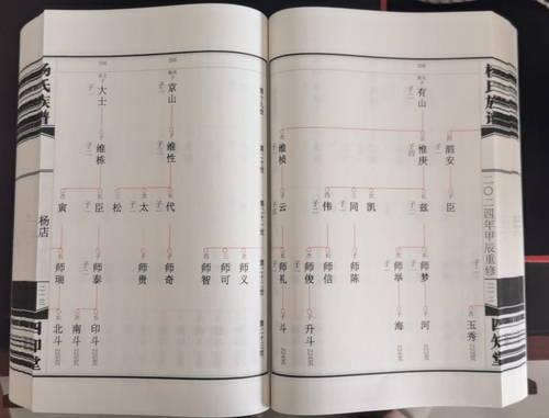 杨氏族谱内容简单,只有生子配氏情况,格式采用北方常用的苏氏吊线图。宣纸印刷,仿古线装268个筒子页。