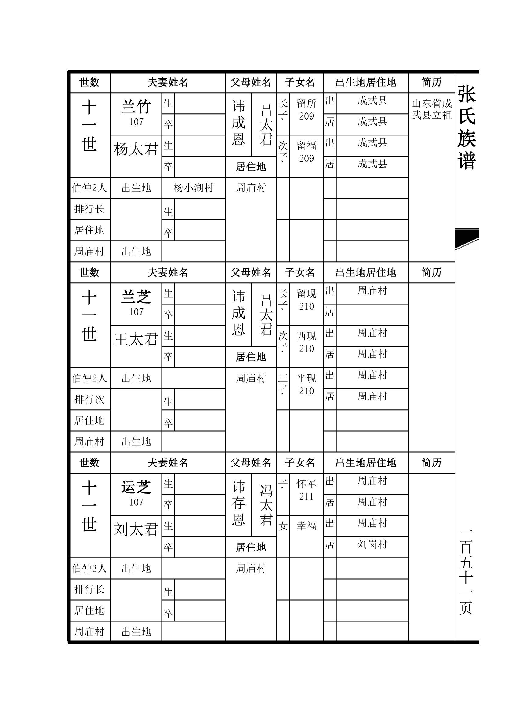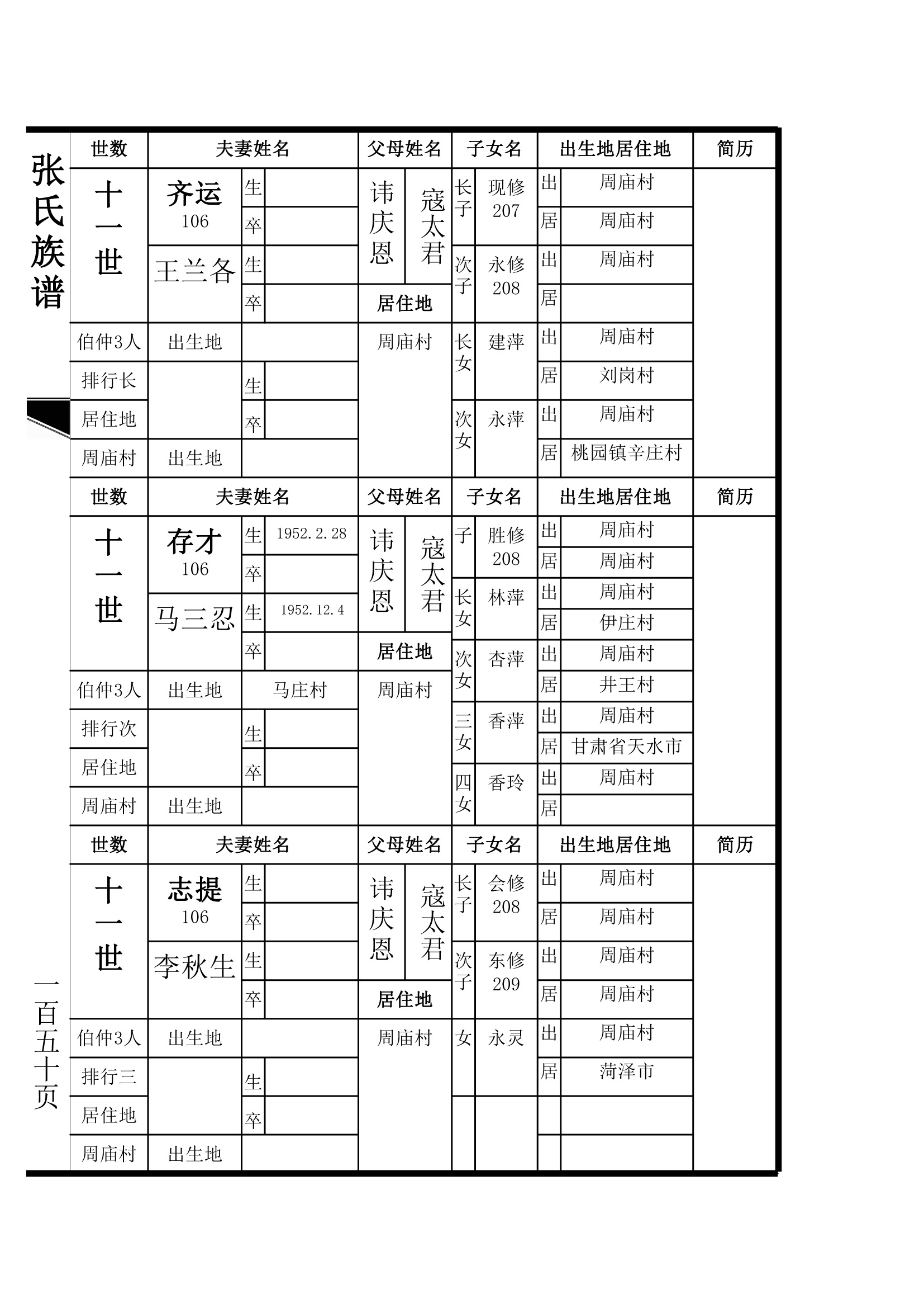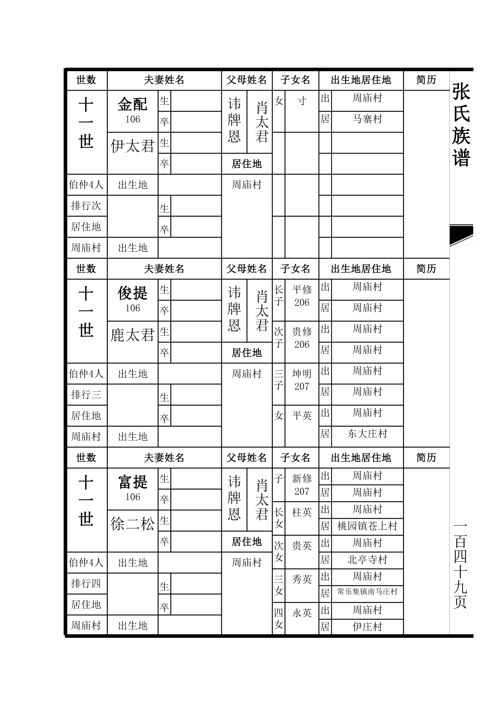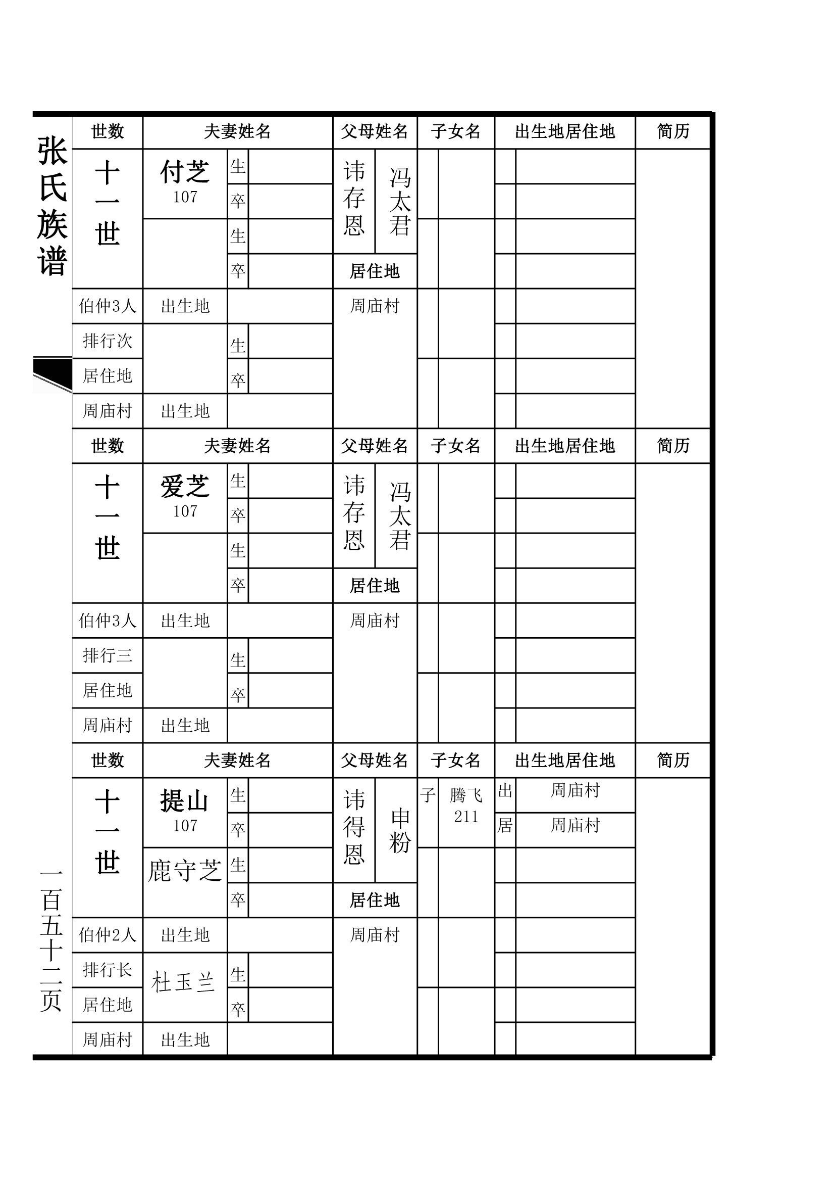 2021年编修,16开本,锁线精装,806页,120本。主编:张敬彬 2021年编修,16开本,锁线精装,806页,120本。本族本无族谱,系根据各支谱轴上的资料汇总而编纂,上几世失传,后面也有断代的,也算是创谱。主编:张敬彬,退休教师、小学校长,以修谱建祠为己任,耻做无谱之人,壮年有修谱之志,历时近十余年,终完成所愿。本谱样式系主编根据参考别家样式设计,一页三人,一人一表。表中列姓名、配偶及生卒日期,简历,父母何人,家居何地,生于何地,排行老几,生子女几人,各人的出生地与居住地等,另外本人及父亲、子女的链接页码。内容详尽而明了。世系后又加速查表,便于查找。字体全部选用宋体,清晰而大方。 ...