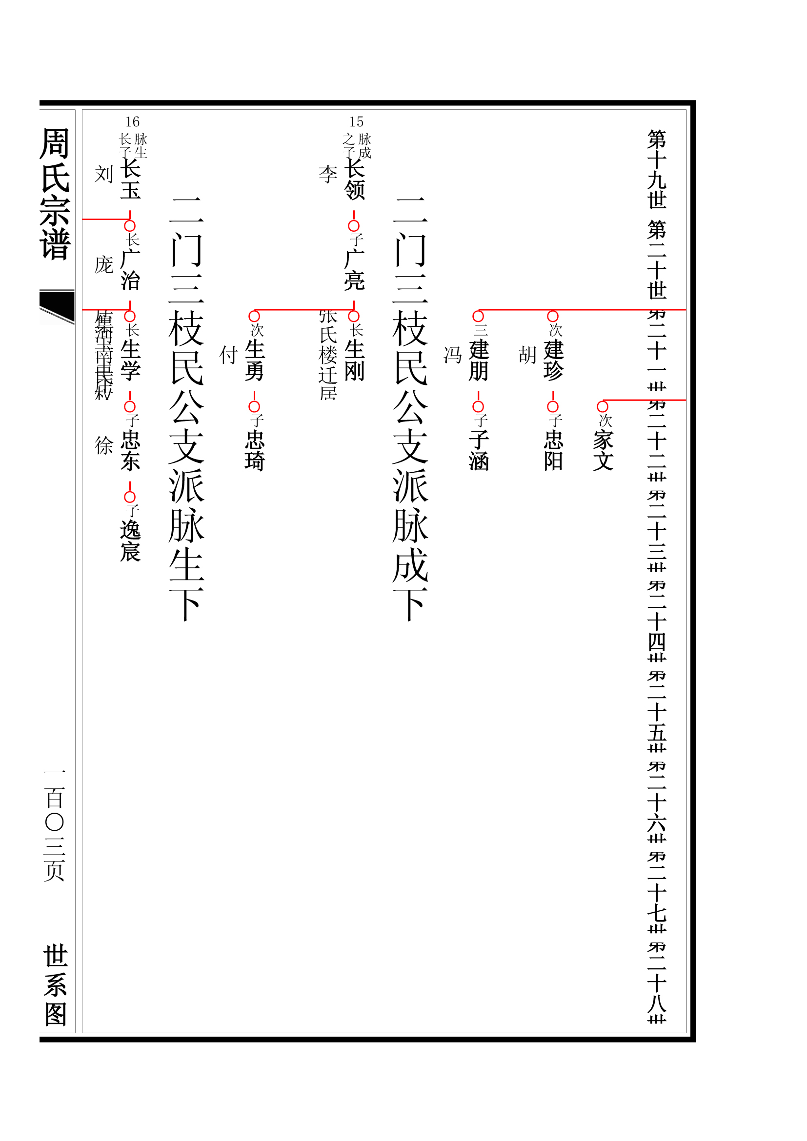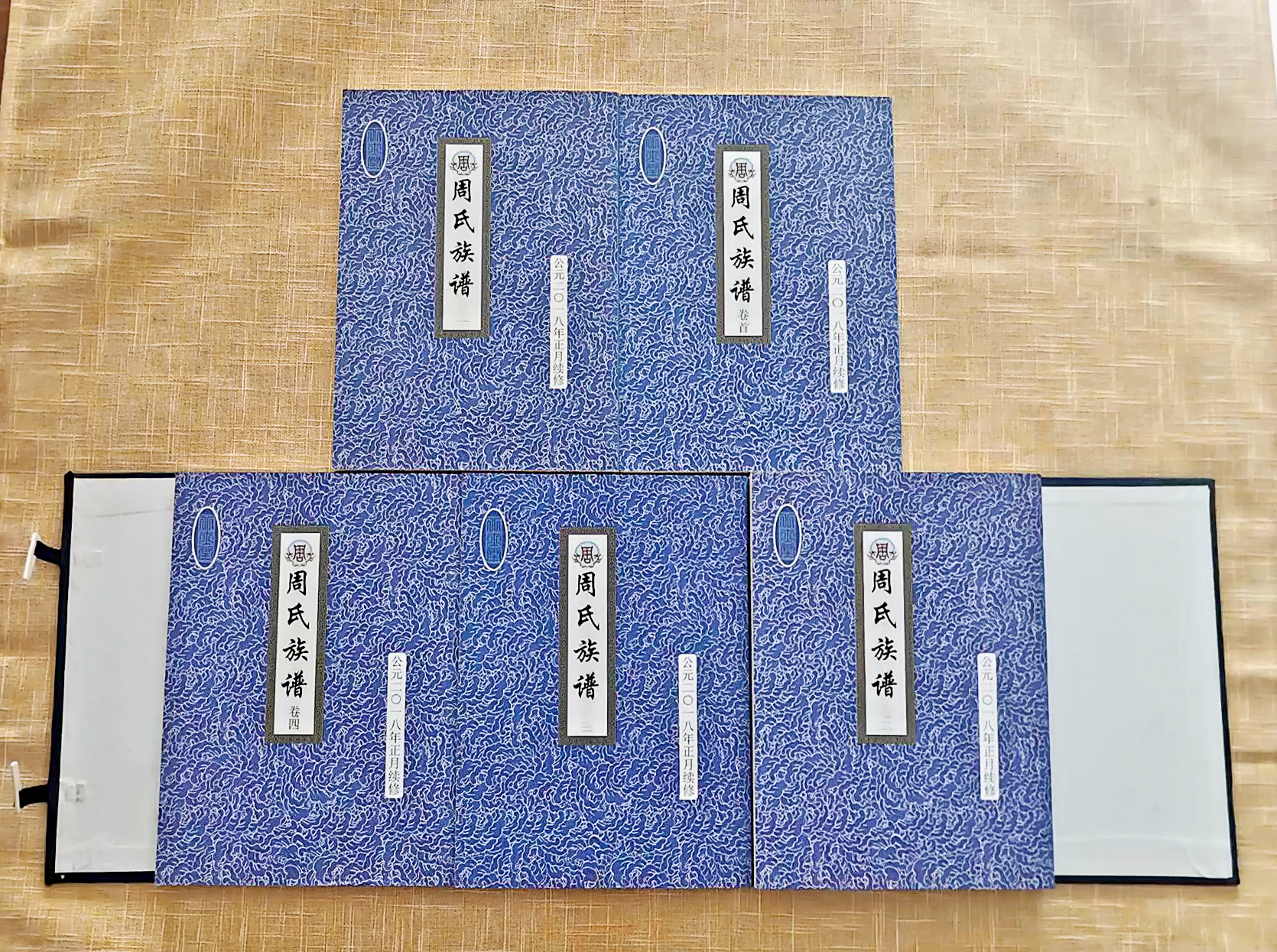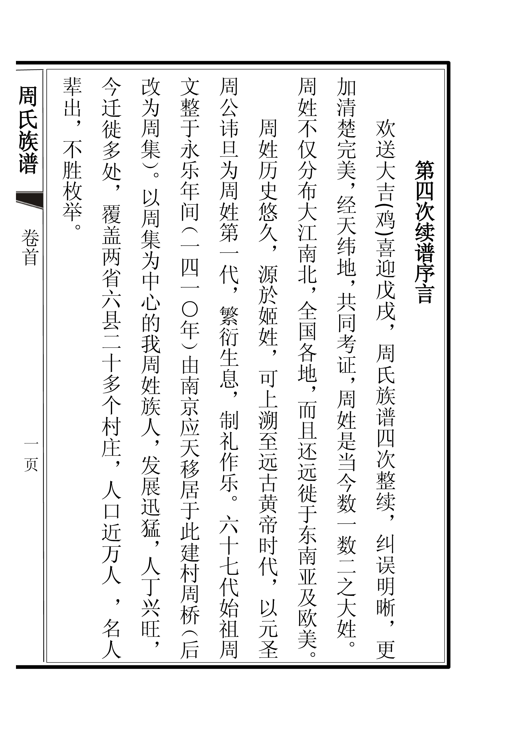 族众分布于牡丹区周集村、曹县楼庄祥符寨、兰考周庄等村庄。卷首自成一卷,内容有序言、姓源、排行字、历代祖像赞、历代祀典、庙图墓图、周公世系等。一至六卷为周氏世系,分支分村记录世系,世系采用吊线图格式,每图10代,只记录生子与配偶信息,每图第一代与最末代有上下链接页码。体现北方入谱内容简单,世系清楚易查的特点。字体用宋体,简明而古朴。...