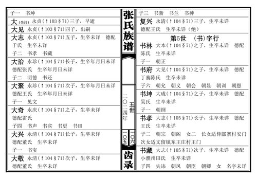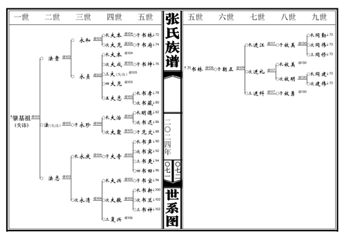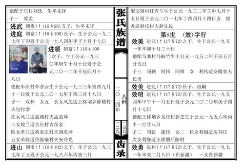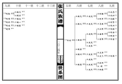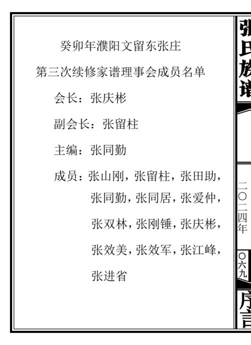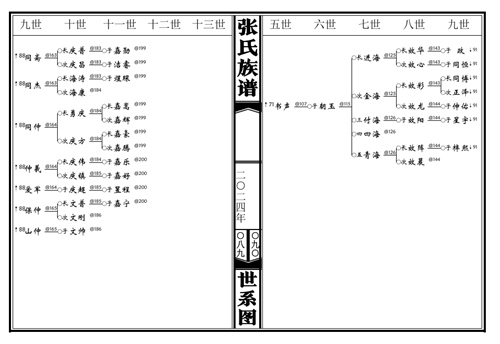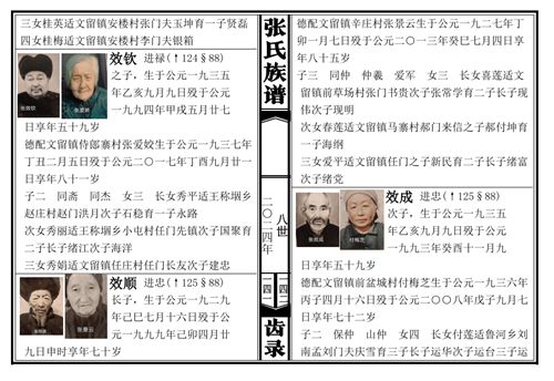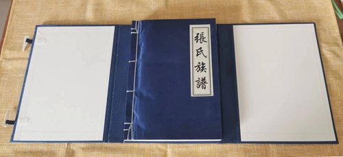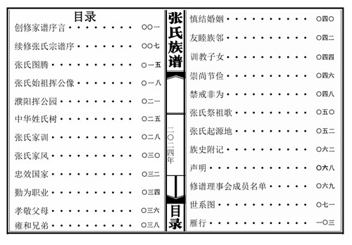 濮阳东张庄张氏族谱 序言曰:古人有三大孝道:续家谱、修祖坟、建祠堂。宋司马文公曰:谱乃家之史,史乃国之谱也,谱不立则昭穆混,渊源慒,人不知其祖,何异禽兽? 2023年4月经族人张庆彬召集,成立族谱编修理事会,由张同勤老师主修,全一册,宣纸印刷,大16本,缎面包角仿古四眼线装,112个筒子页,15套,族谱内容丰富,包括历次序言,张氏图腾、挥公像、家训、家风、祭祖歌,族史资料,谱文等,谱文分两部分:现代横式吊线图与个人行传,吊线图与行传,各自内部父子有页码链接,两者又有互通页码链接,非常方便查询。行传为现代横排,内容有生卒年月日,妻为何地何府何氏何名,女也有生卒年月日与所适何付何府,另有夫妻照片,非常详尽。 ...